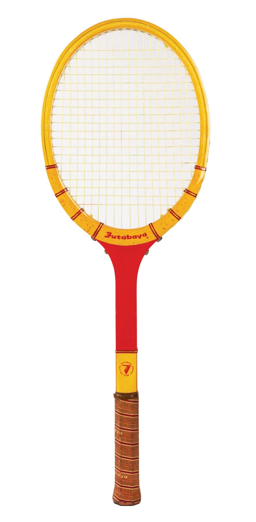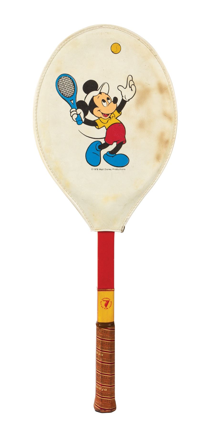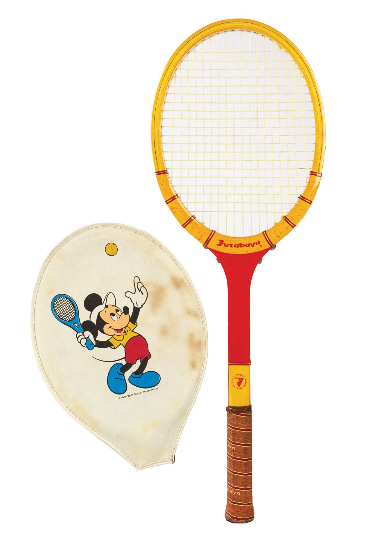 (Walt Disney World, 1978) A rare tennis racquet with a Mickey Mouse cover that belonged to Bob Phelps of Walt Disney World's costuming division. The tennis racquet was made by Futabaya, and was used by Phelps while participating in Walt Disney World's cast member and management sports events. The racquet measures 27" long and is in very good condition with minor wear from use. The cover is in fair condition with wear and discoloration throughout.