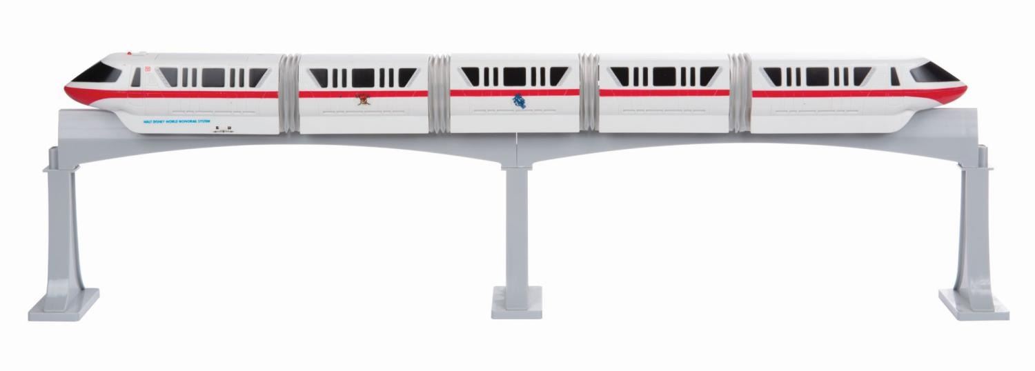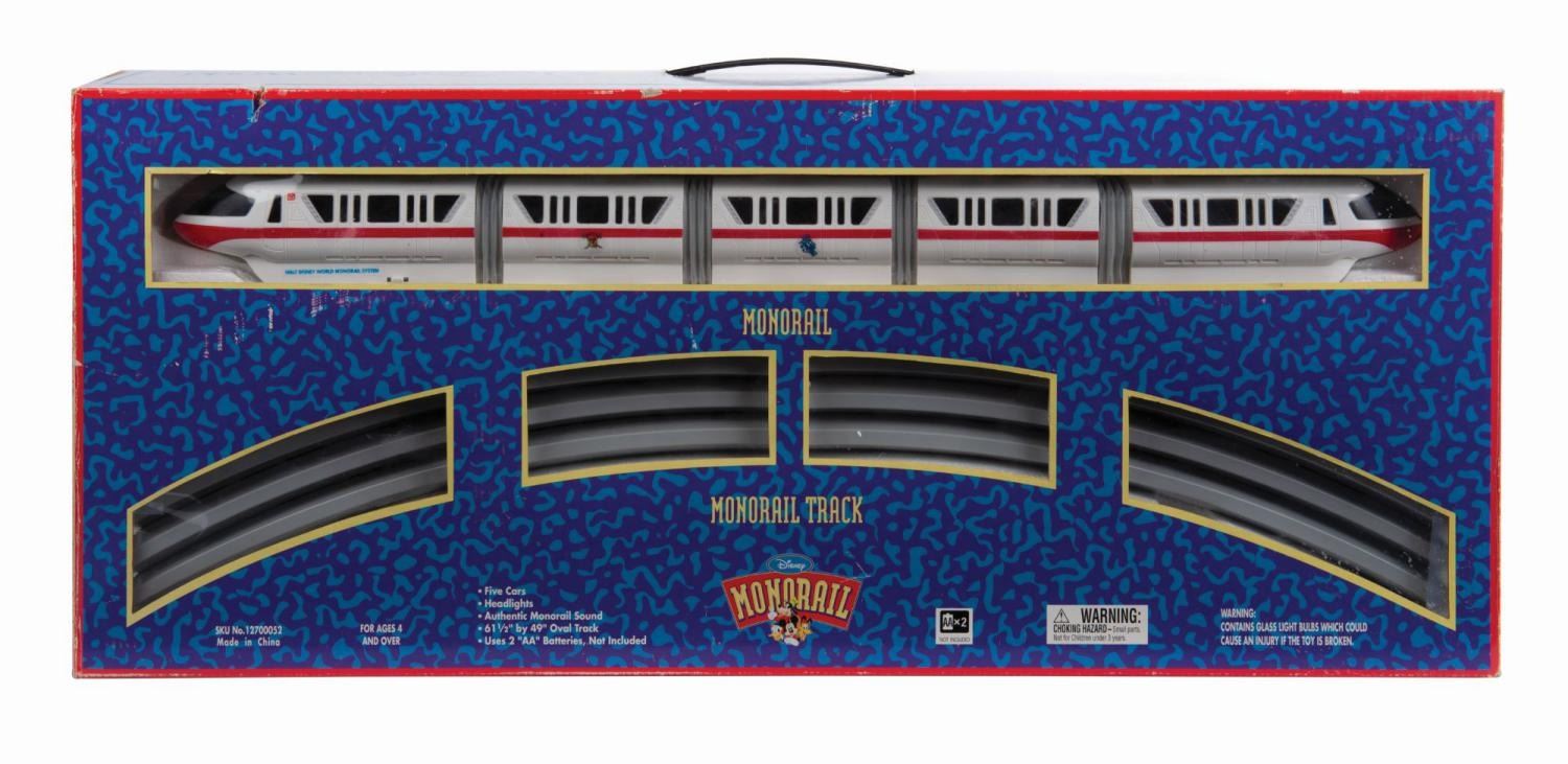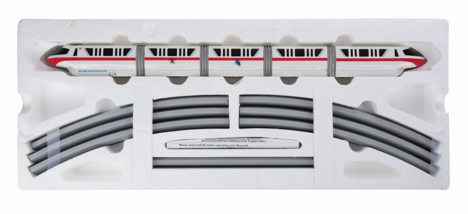 (Walt Disney World, c.2015) An electric Walt Disney World Monorail Train Set. Included in the fine condition set are (5) cars with headlights and "authentic Monorail sound," (12) curved tracks, (2) straight tracks, (14) support poles, (5) joints, and operating instructions, packaged inside the original box. Measuring 11"x27" and 4.75" deep the original box is in good condition, retaining original Walt Disney Attractions price sticker, with scuffs and minor wear to edge, corners and faces throughout, with some color fading to graphics.