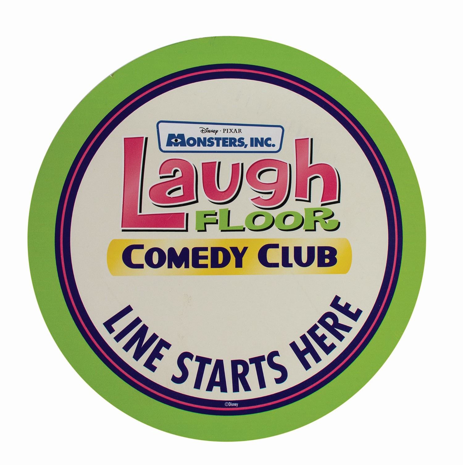 (Walt Disney World, c.2000s) A Monsters, Inc. Laugh Floor Comedy Club sign from Walt Disney World. This sign was used to designate the head of the line and reads "Line Starts Here." Measuring 16" in diameter, the sign is printed on thick PVC board and is in very good condition with minor wear and scuffing.