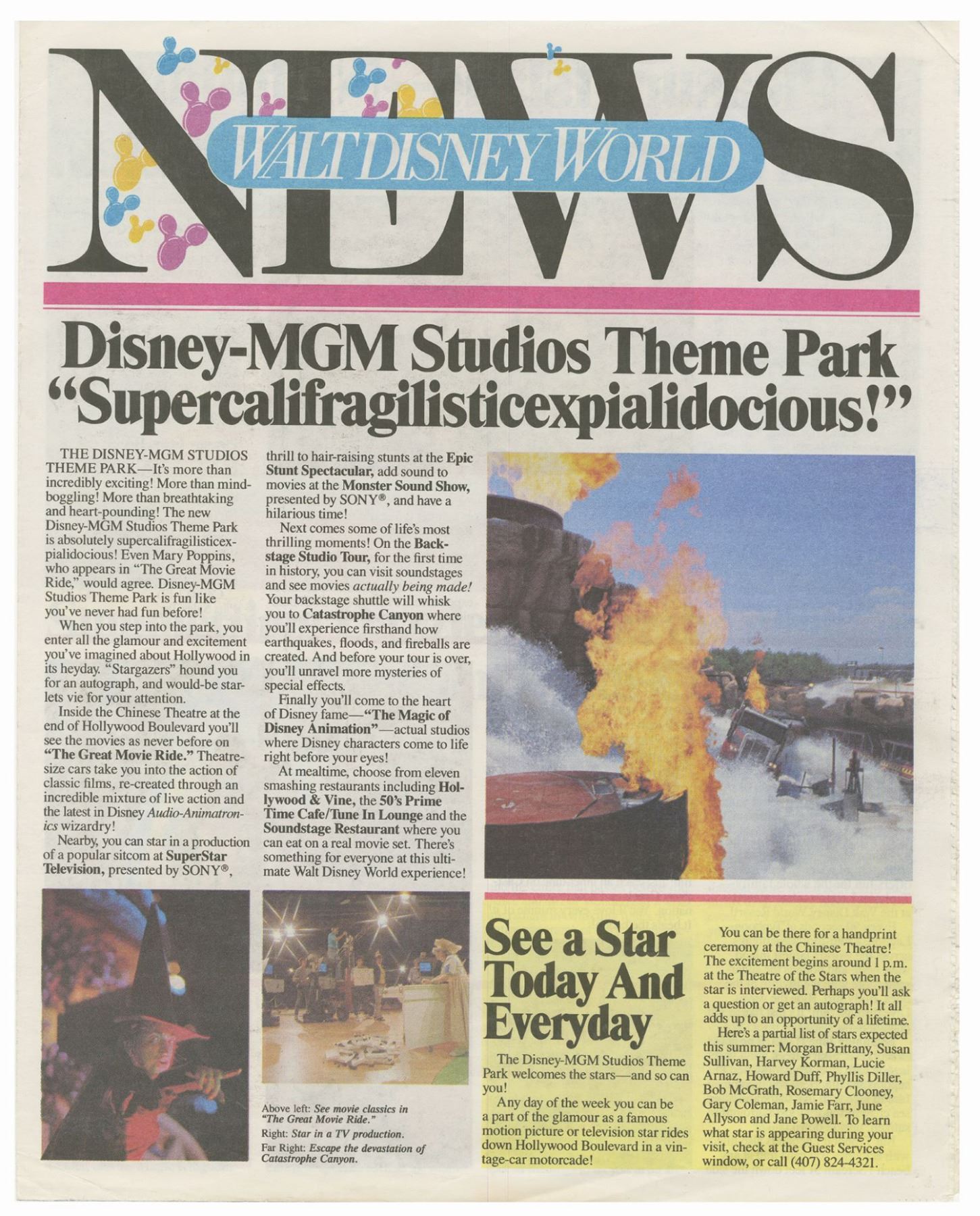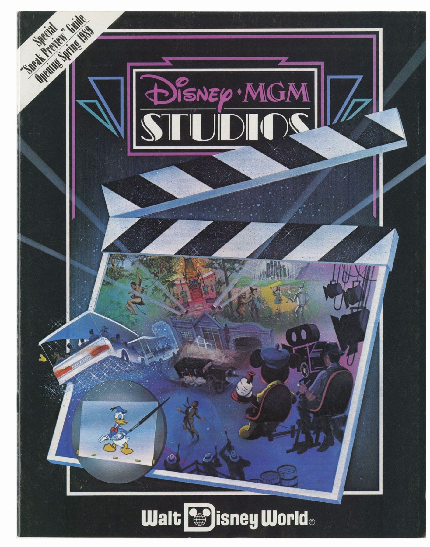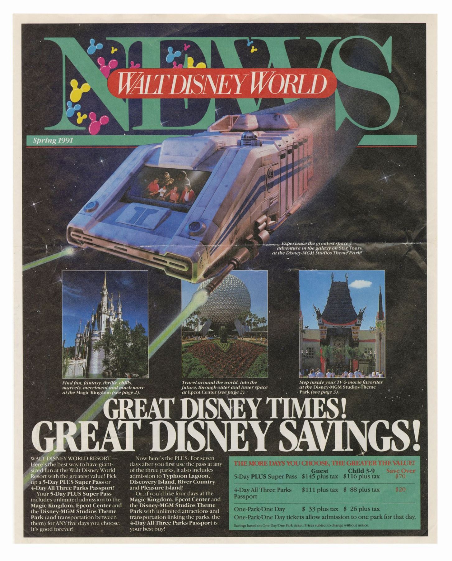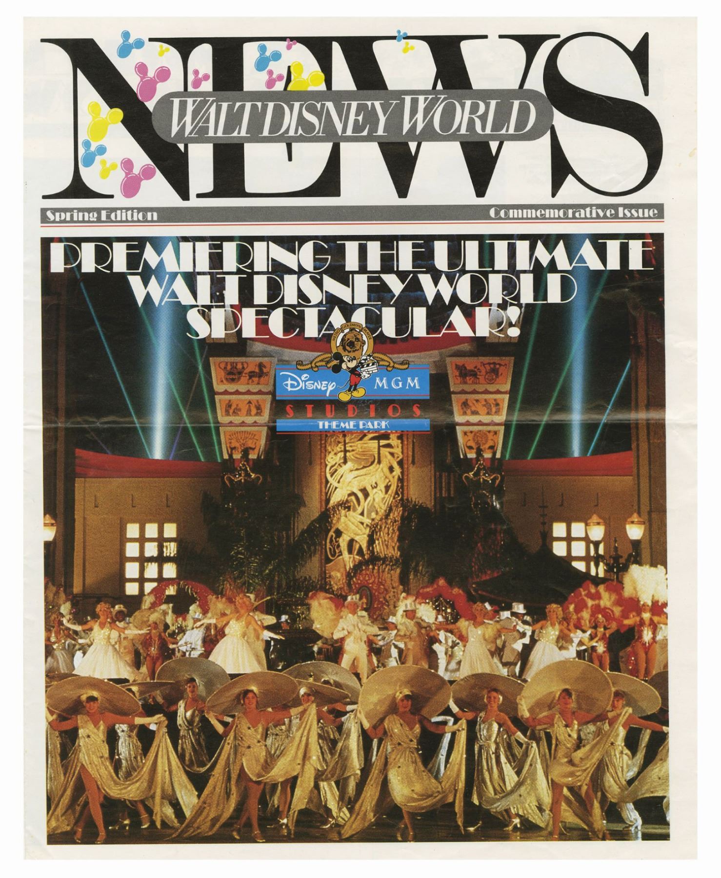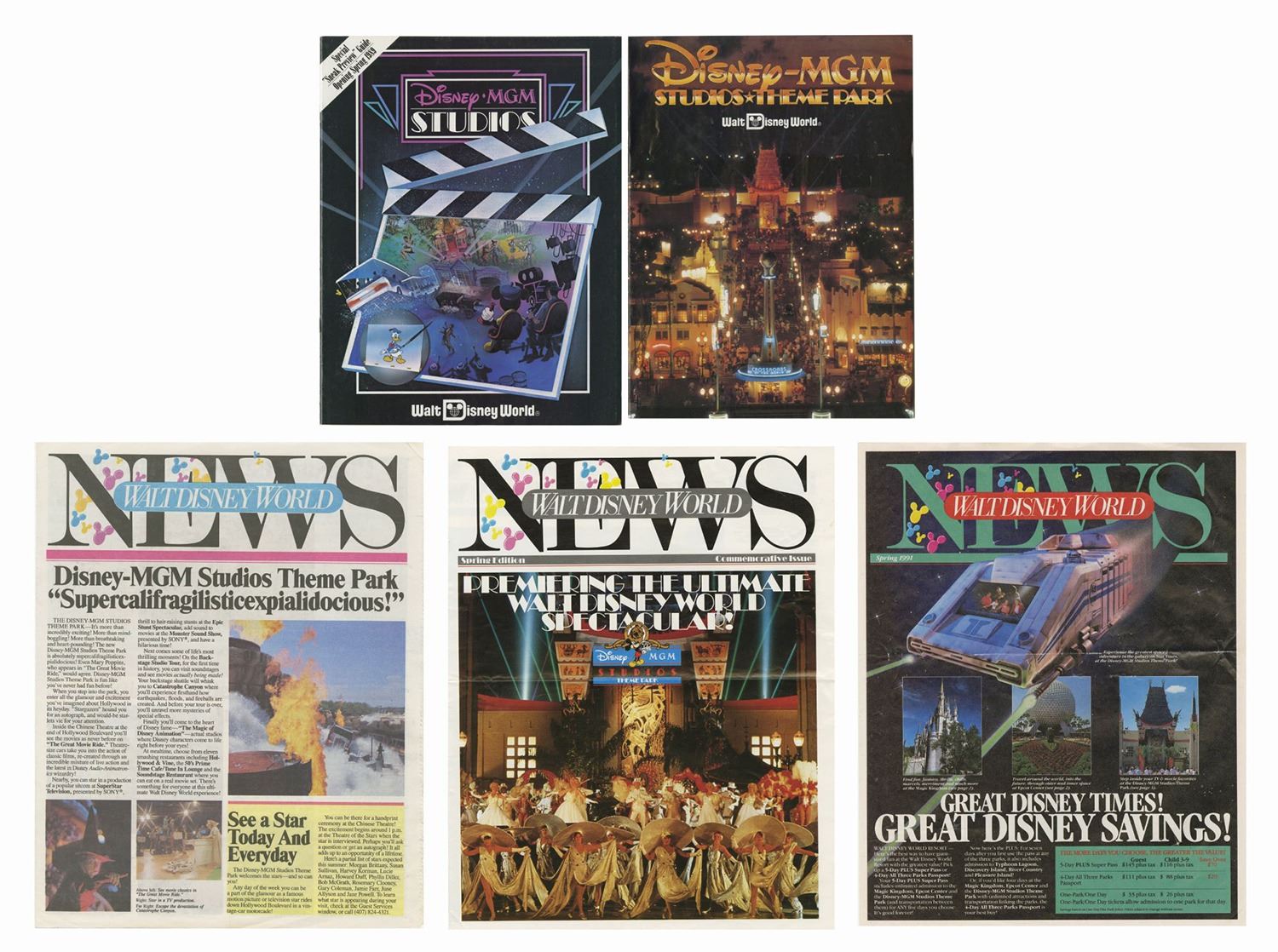 (Walt Disney World, 1988-91) A set of (3) Walt Disney World News periodicals and pair of Disney-MGM Studios magazines. Each periodical contains articles and information on the new Disney-MGM Studios park. The newspapers have 4 pages each and measure 14"x11", and the magazines have between 13-14 pages and measure between 10.75"x8" and 11"x8.5". The condition is very good overall, with minor wear to the edges and creasing through the middle of the newspapers from being folded.