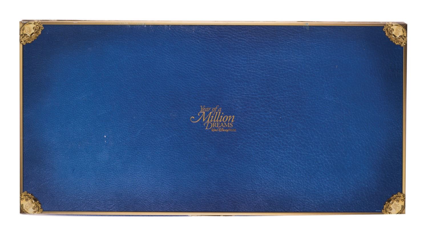 (Walt Disney World, 2007) A boxed invitation to three days of magical premieres for the Year of a Million Dreams, 2007. Designed to appear like a chest, the box holds an invitation written upon a scroll nestled inside, along with a booklet discussing new attractions like the Finding Nemo musical and detailing the schedule for the event. Measuring 7"x14" and 2.5" deep, the box is in good condition with tearing to one of the corners and to the pocket holding the booklet. There is some surface scuffing, and several scuffs have been covered with black permanent marker.