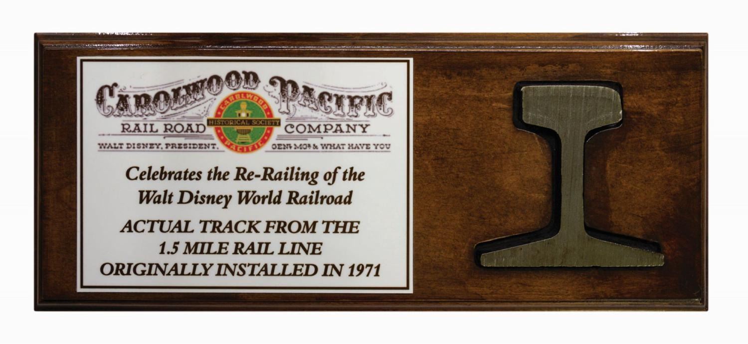 (Walt Disney World, 1971) A segment of the original track that was in use when Walt Disney World opened in 1971. The segment was removed during a subsequent re-railing, and converted into a limited edition commemorative plaque by the Carolwood Pacific Historical Society. Only 200 of these plaques were produced, and the piece is accompanied by a Carolwood Pacific Historical Society COA. The metal track segment was polished for presentation and measures 3.5"x3.5" and the plaque is 5.5"x13.5". The piece is in fine condition with minimal wear.