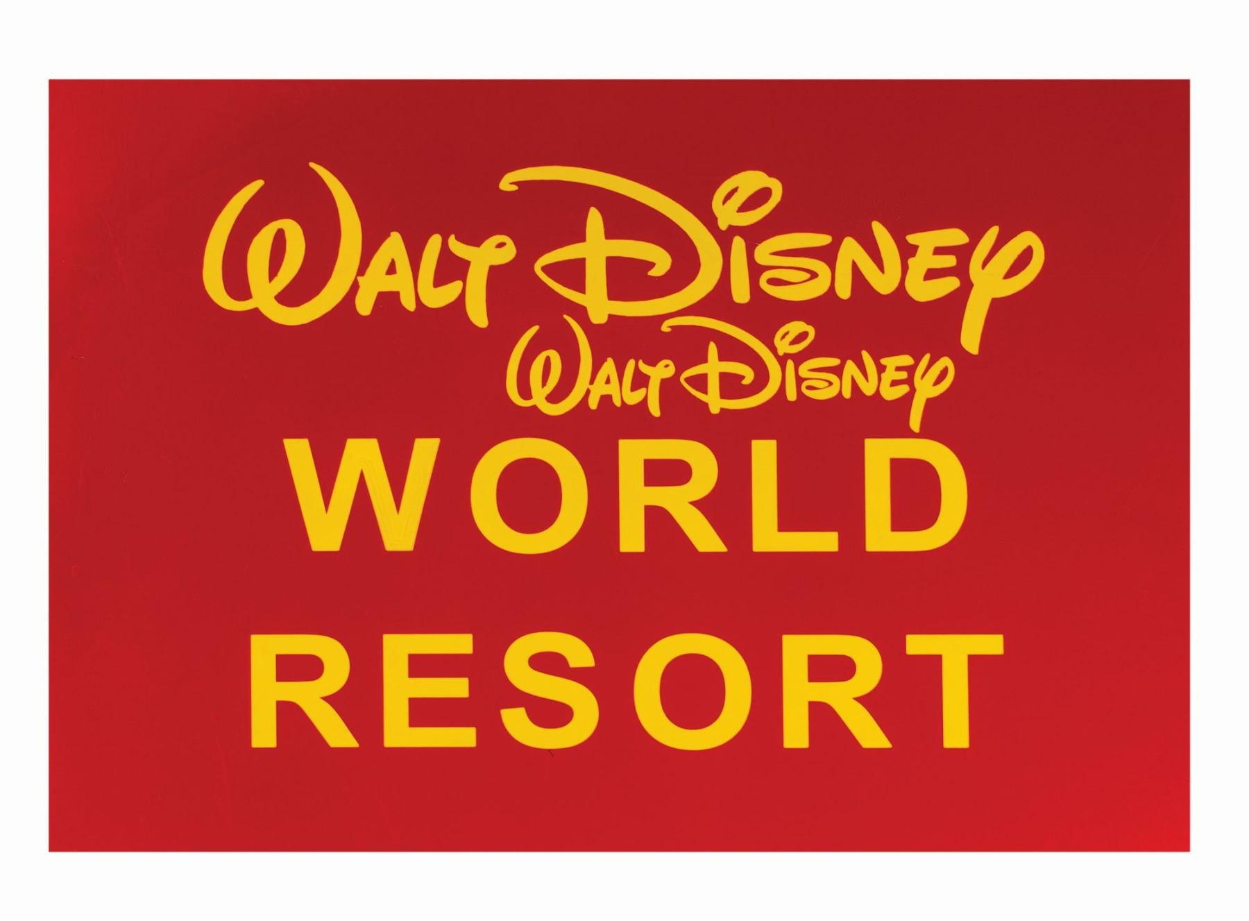 (Walt Disney World, c.1990s) An original sign featuring the name of the Walt Disney World Resort. Likely created as a printing test, the sign features the name Walt Disney twice in different sizes, and the depth of the letters was being experimented with in the "W" of World. The sign measures 14.25"x21.25" and presents very nicely.