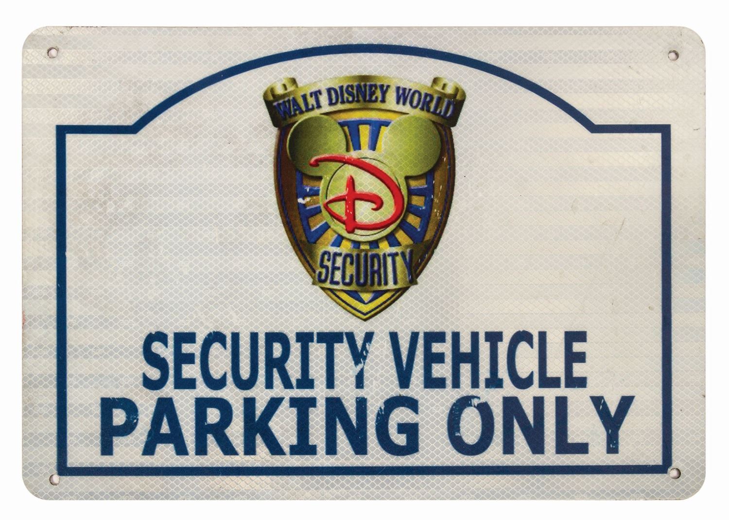 (Walt Disney World, c.2000s) A metal parking sign used to designate spaces for security vehicles at Walt Disney World. The single-sided sign is printed on metal and prominently displays the newer security badge logo. Measuring 12"x18", the sign is in fair condition with some color wear to the logo and text, and some scuffing to the reverse.