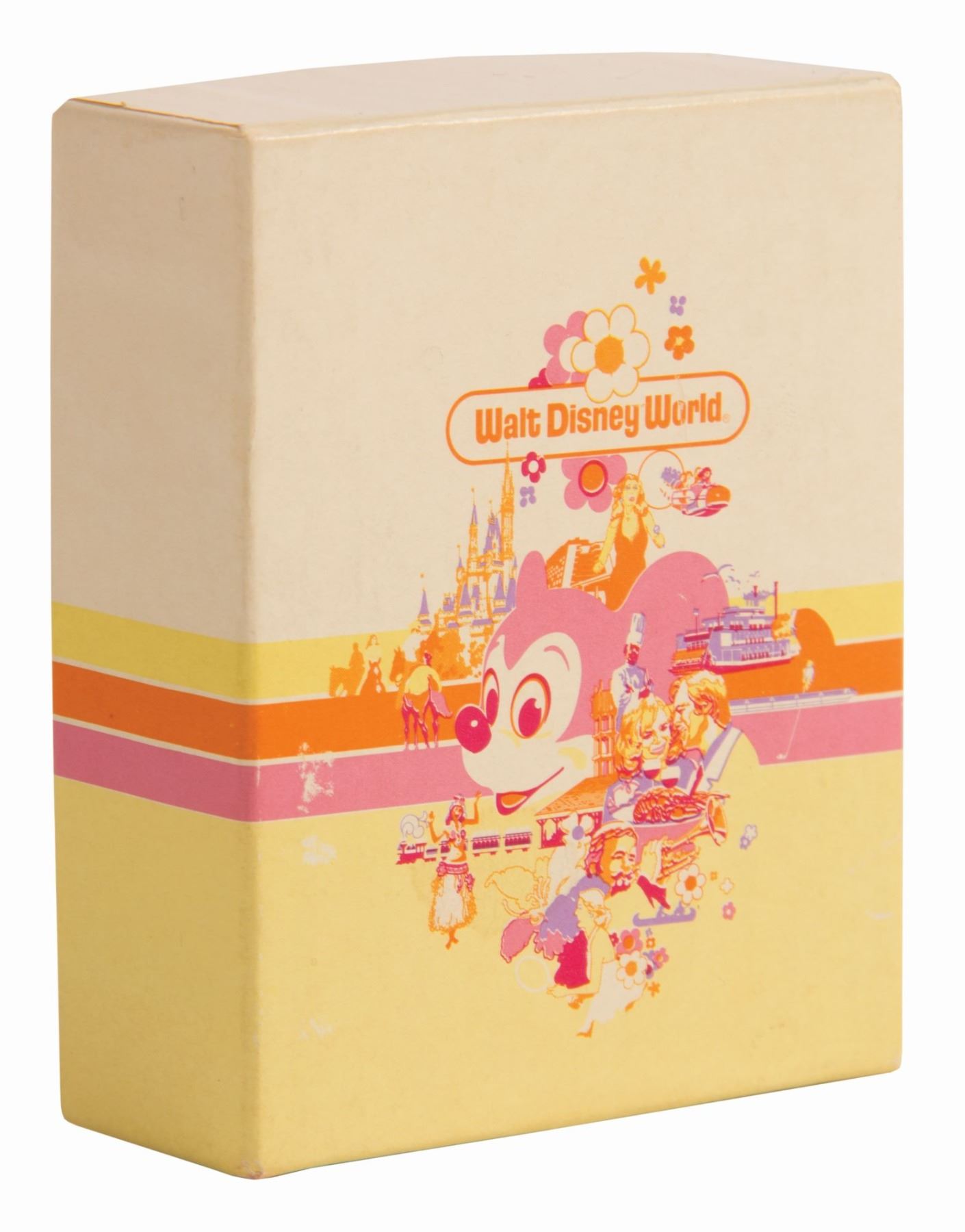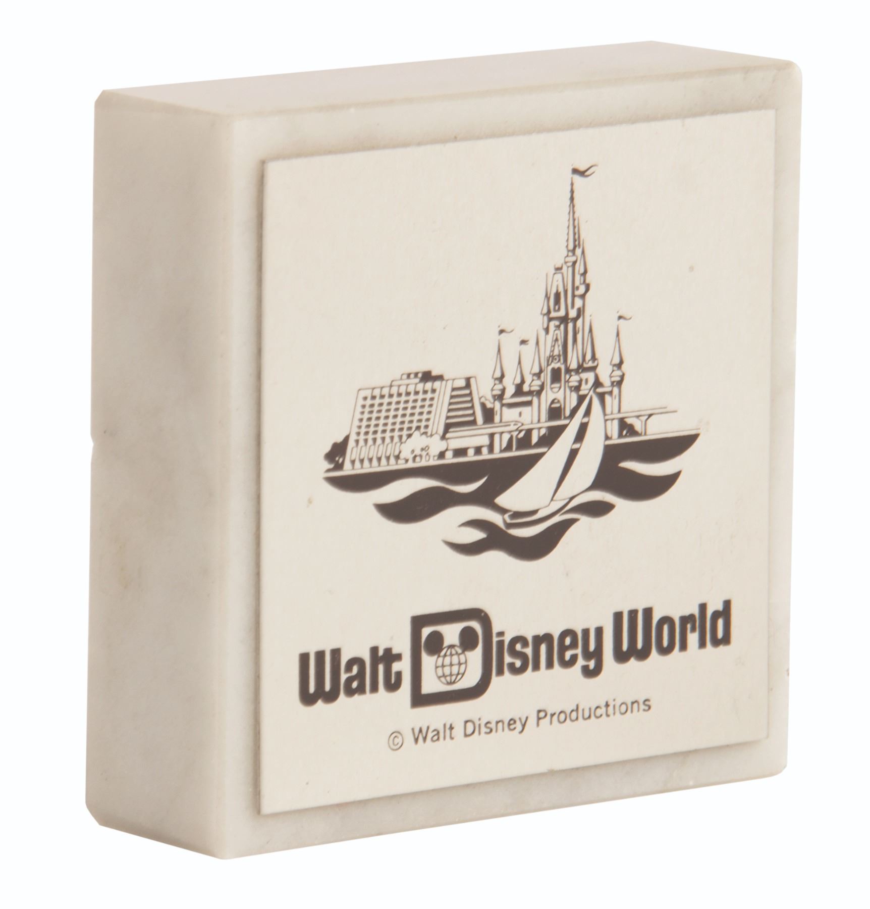 (Contemporary Resort, c.1980) A souvenir marble paperweight that features a design of Cinderella Castle and the Contemporary Hotel. The paperweight comes in its original vibrant Walt Disney World box. The paperweight measures 3.25"x2.75" and is in very good condition with minor wear from use.