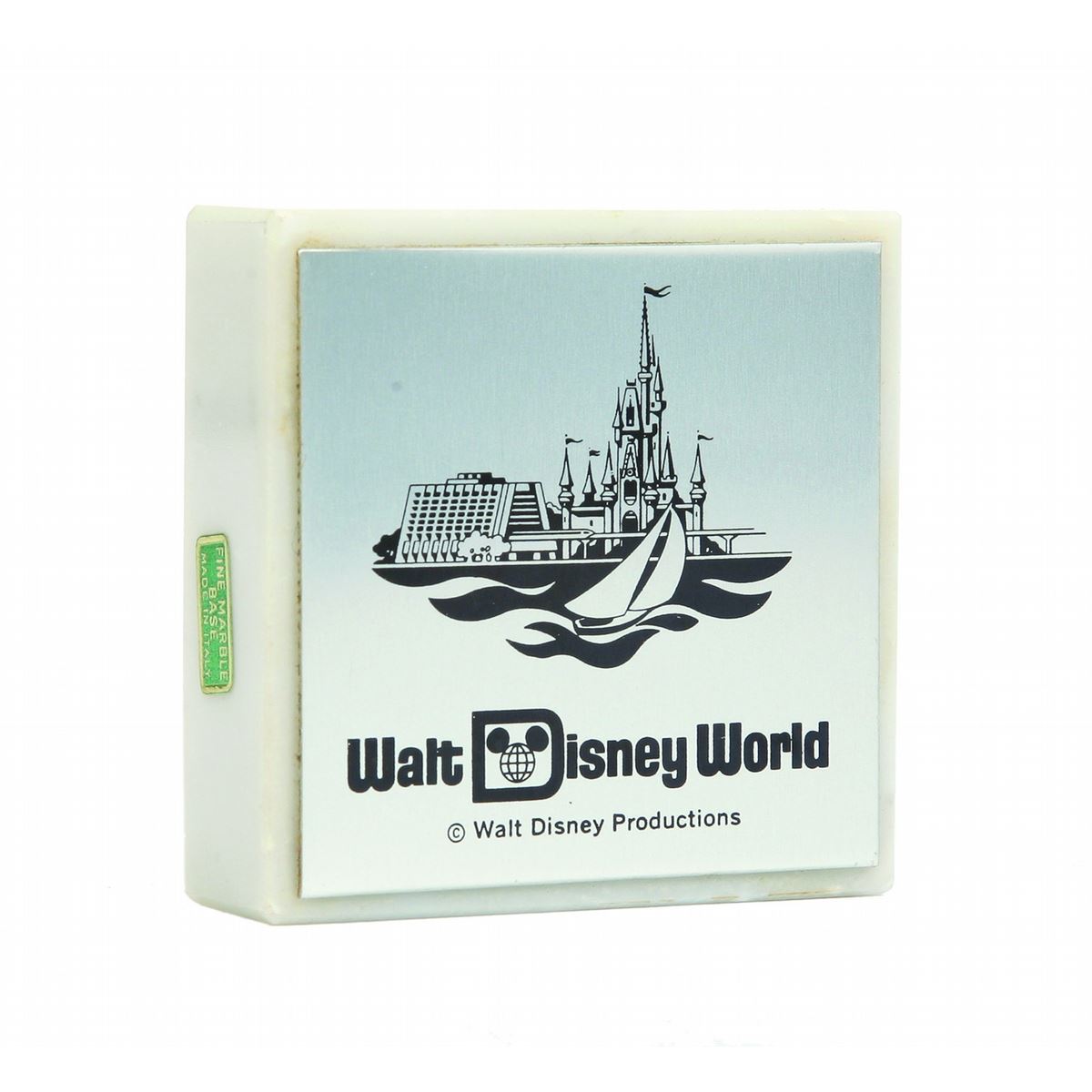 (Walt Disney World, 1970s) A Walt Disney World souvenir paperweight featuring the original Walt Disney World logo on the surface below imagery of the park. Measures 2.5"x2.5"x0.75". In good condition with minimal wear from use.