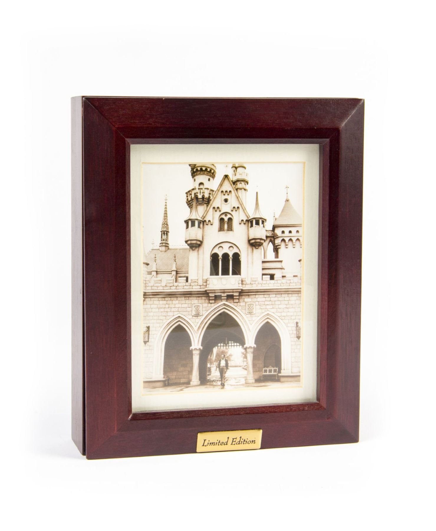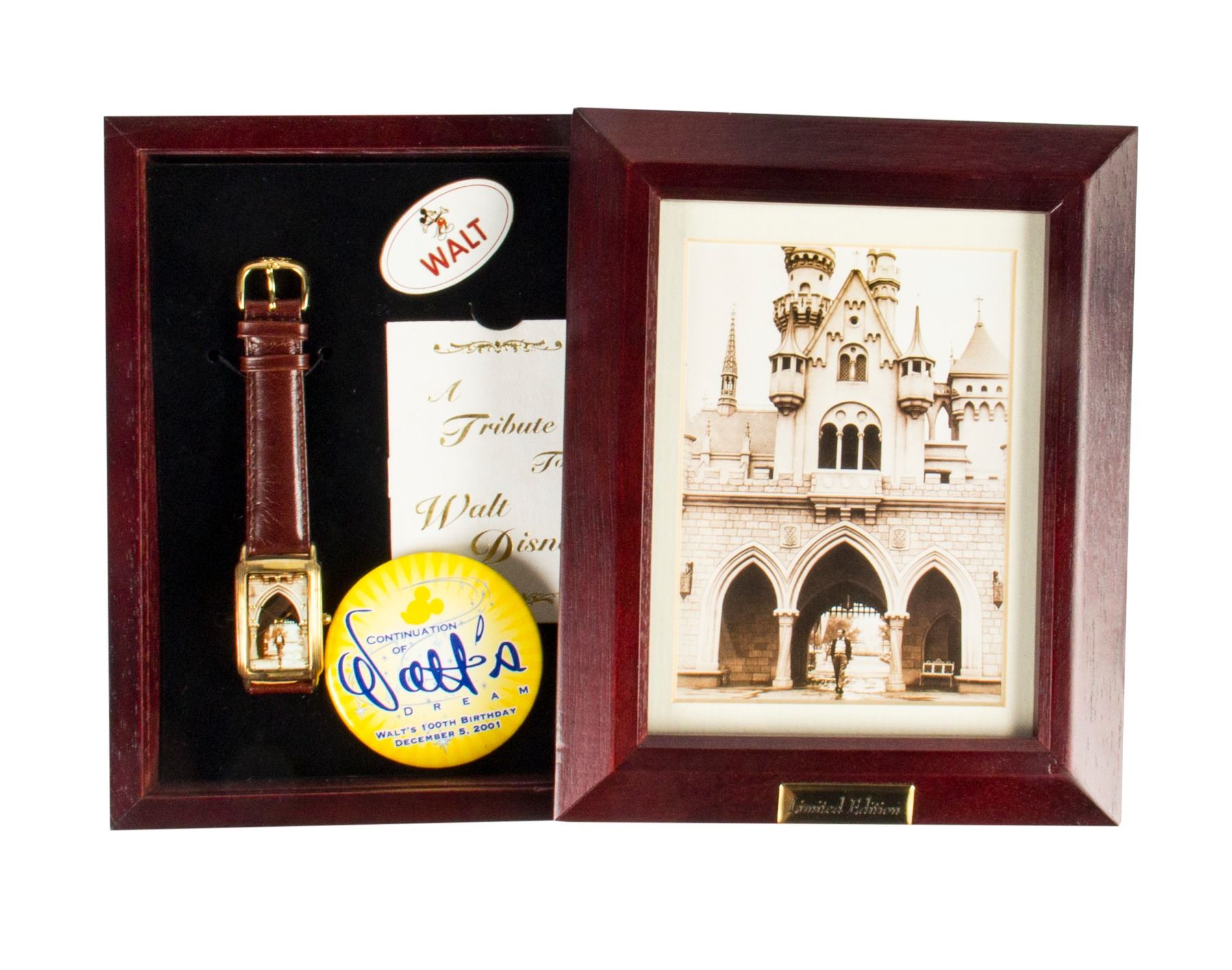 (Disneyland, 2001) A limited edition boxed set created to celebrate Walt Disney's 100th birthday on December 5, 2001. The set includes a watch numbered 431/1000, a miniature cast member name tag that reads "Walt", an anniversary button, and a small "Tribute to Walt Disney brochure which gives information on the items. The set comes in a wooden box featuring the iconic image of Walt Disney walking through Sleeping Beauty Castle on the lid. The watch face features the same castle imagery as the box. The box is constructed in a way that it can be displayed on a wall, and measures 8"x6.5" and 2" thick. The condition is very good with little wear.