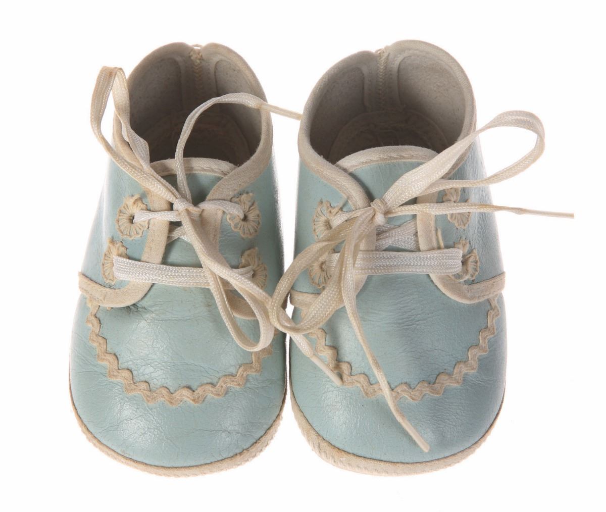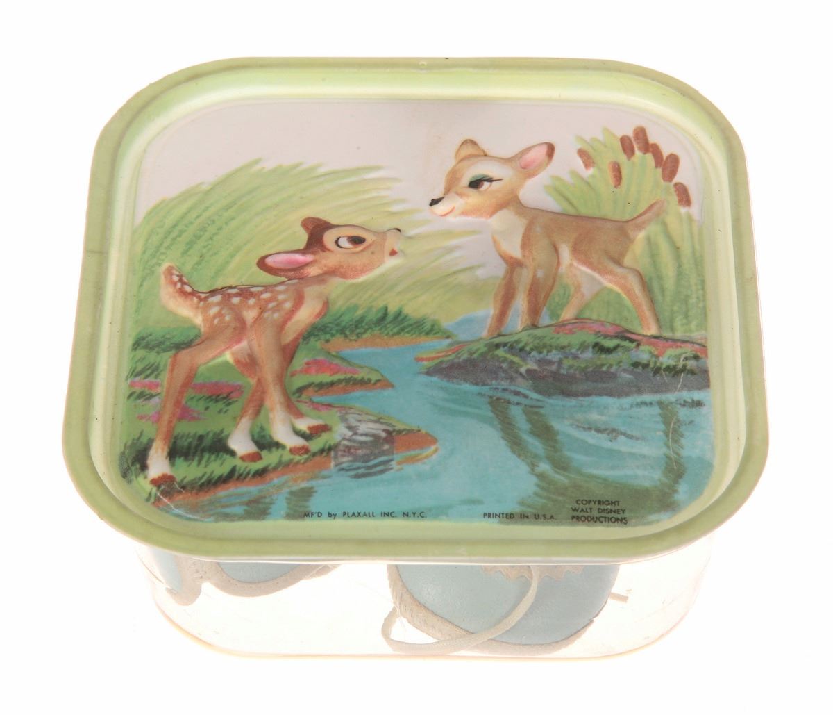 (Plaxall Inc, 1950s) This pair of baby shoes created by Plaxall Inc, come in a colorful decorative container featuring artwork from Walt Disney's Bambi. The lid of the container is advertised as a nursery plaque to hang on the baby's wall. Comes with Container and Shoes only. Size 0. Container measures 5"x5"x2.5". Shoes are used, in good condition with some wear.