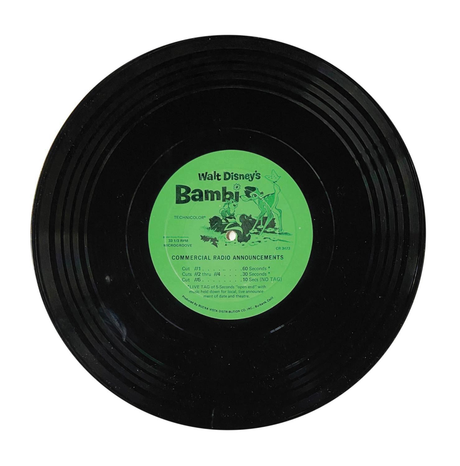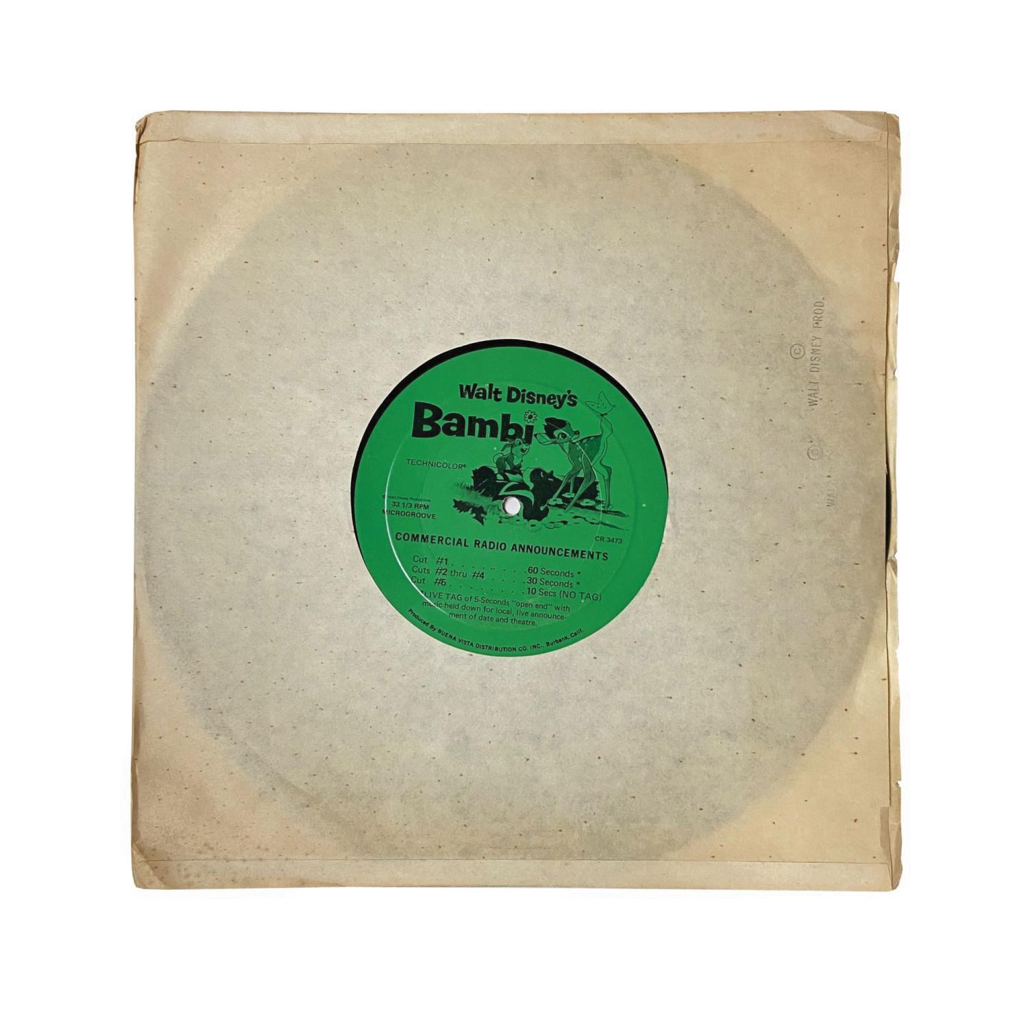 (Disney, 1977) A Walt Disney's Bambi Commercial Radio Announcements 33 1/3 record, containing five "cuts" featuring the voice of Thumper, choruses, and music from the film. Such records were utilized by radio stations in advertisement of Disney films during commercial breaks. Measuring 12", the 33 1/3 rpm Buena Vista CR 3473 record is in very good condition with some surface wear from use. The fragile paper sleeve is included.