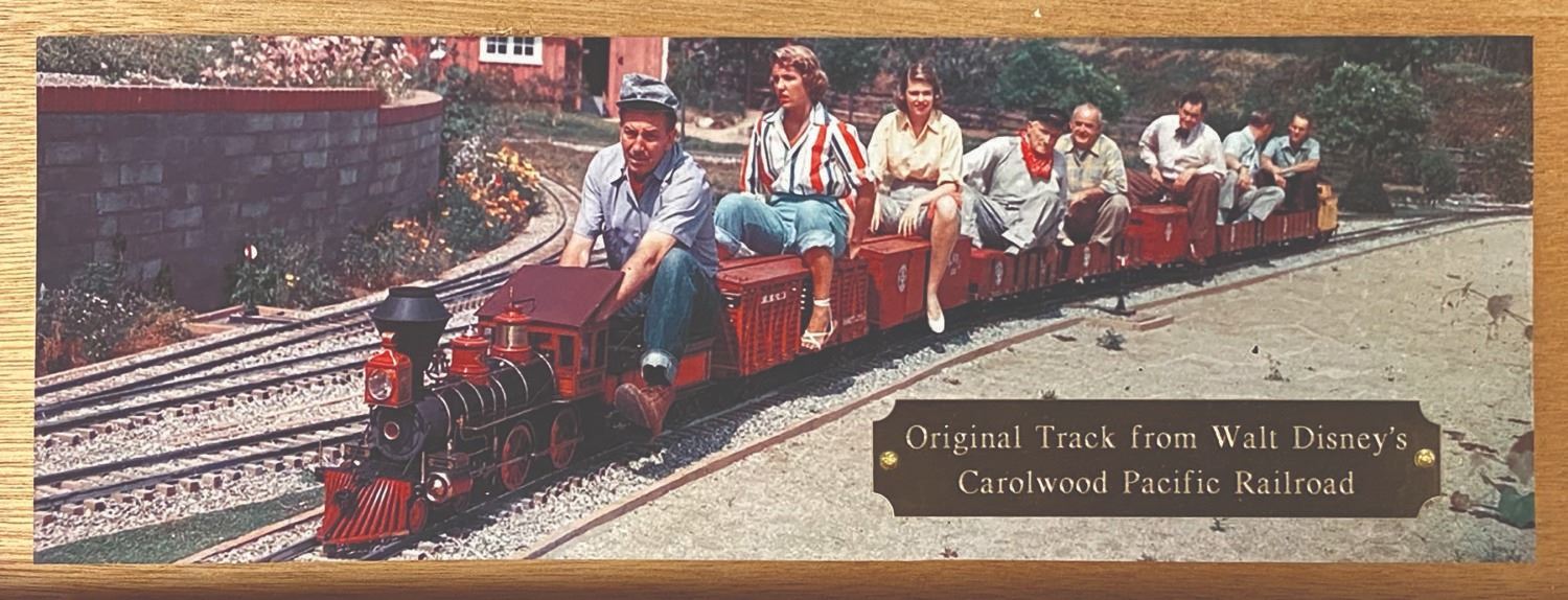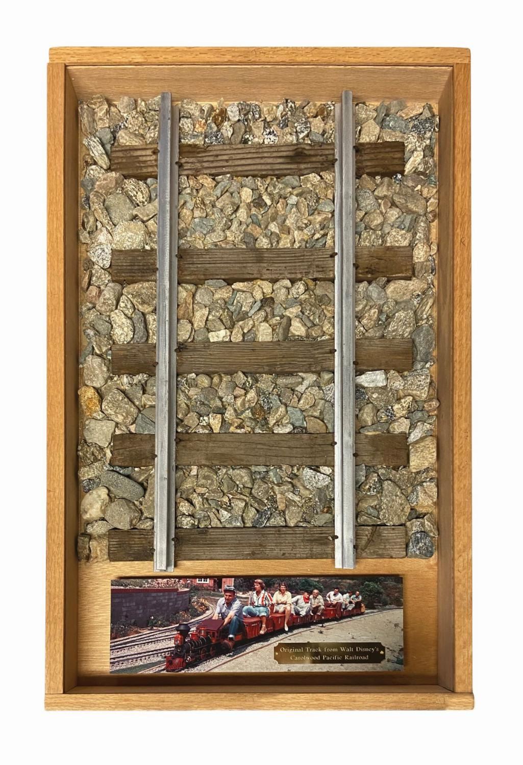 (Disney, 1950-64) A segment of original track from the Carolwood Pacific Railroad, Walt Disney's personal backyard miniature railroad at his Holmby Hills estate. Inspired by friends Ollie Johnson and Ward Kimball, who themselves created personal railroads, Walt Disney turned his lifelong fascination with trains into the Carolwood Pacific, which boasted 2,615 feet of track and a 1:8 scale live steam locomotive named Lilly Belle, after his wife Lillian. This actual segment of the 7 1/4" gauge track over which Walt drove his engine is complete with rails, ties, and spikes. In 1964, with his theme park in full swing, Walt decided to have the Carolwood Pacific track dismantled. Following its removal from his estate, this track segment was framed over an added bed of rocks representative of the original terrain. A photo of Walt and the Carolwood Pacific as well as a commemorative plaque are displayed within the frame. The track measures 22"x13" and the frame is 30"x18" and 3" deep. The track is in good condition with expected age, weathering, and oxidation from over a decade of outdoor use. The frame exhibits some surface wear to both the wood and the glass.