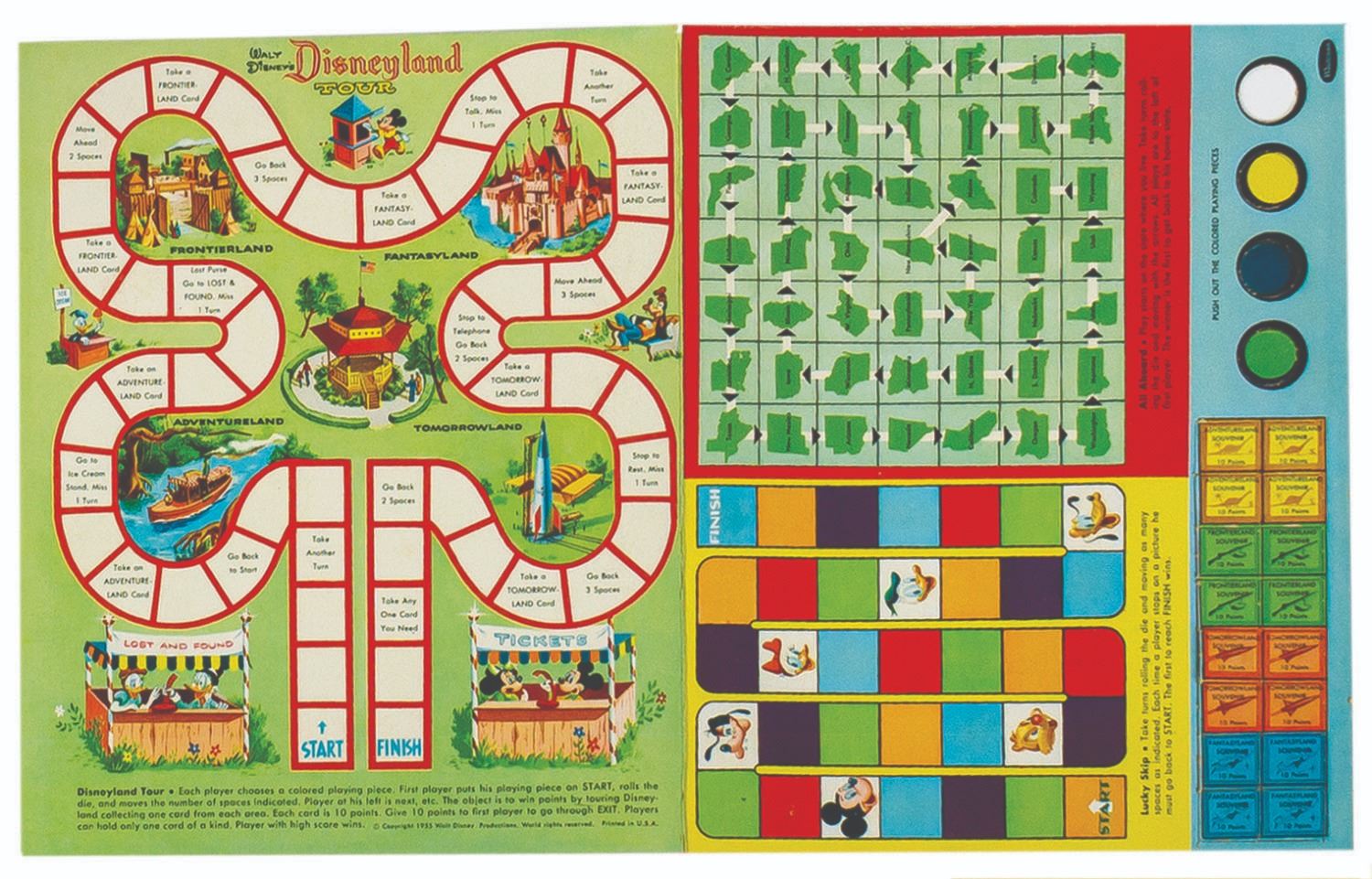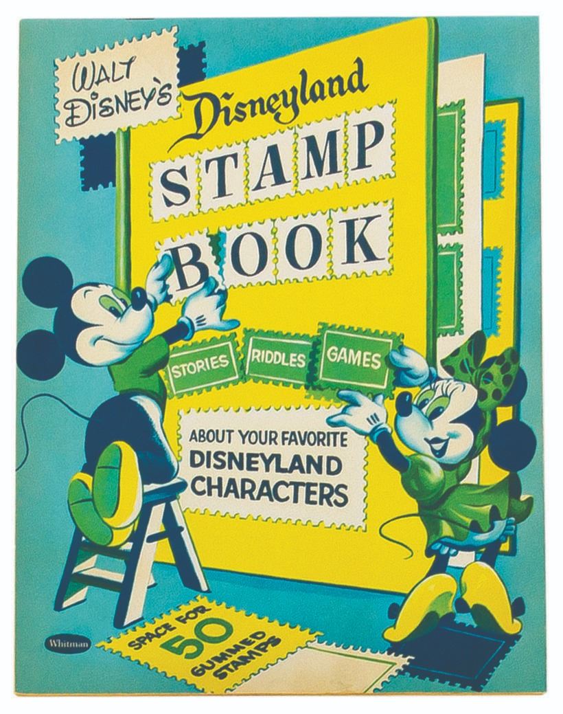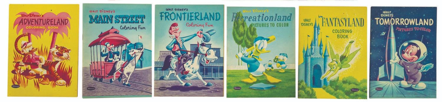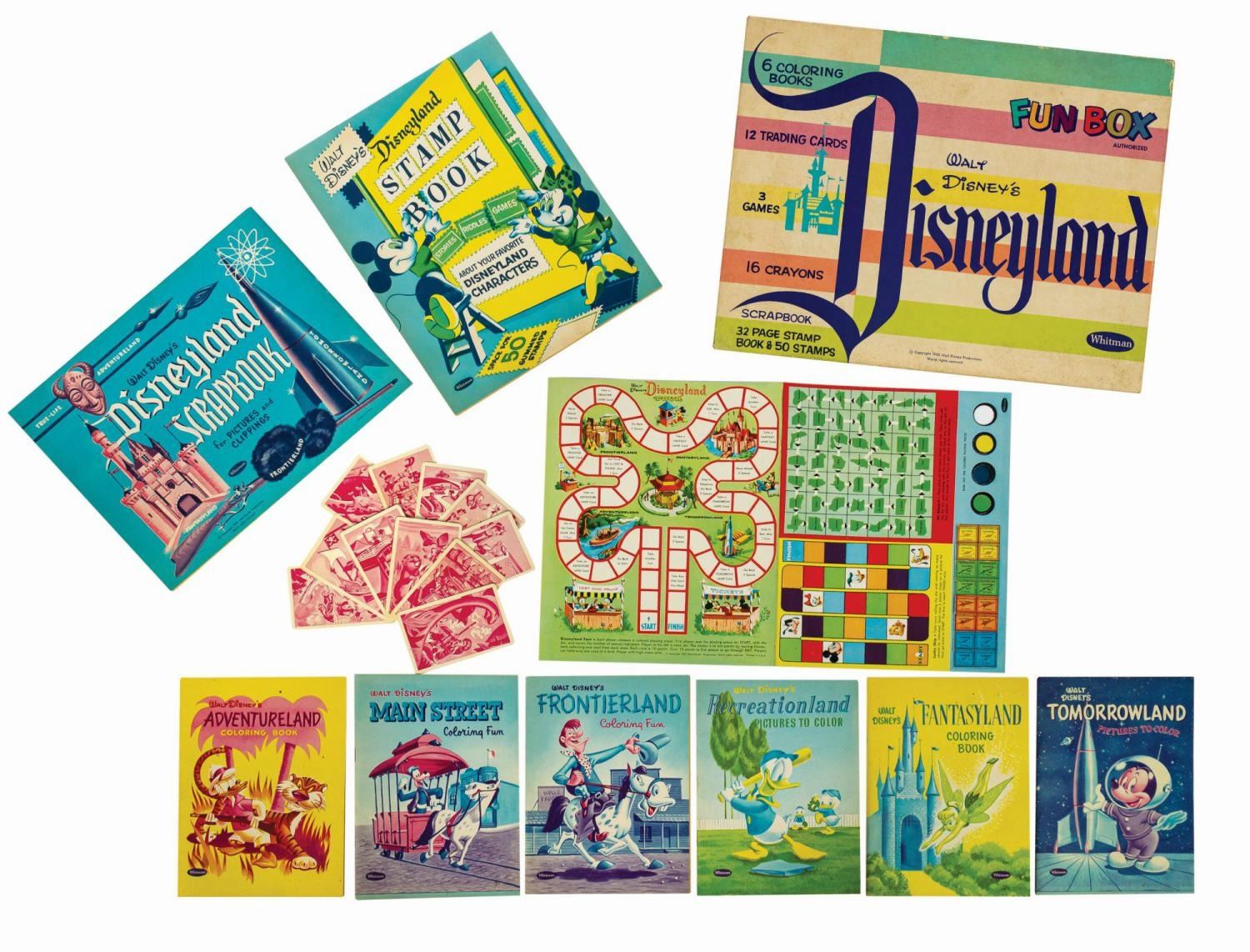 (Disneyland, 1955) A Walt Disney's Disneyland Fun Box activity set manufactured by Whitman. The kit contains (6) park lands coloring books, including "Recreationland," a Disneyland Scrapbook, a Disneyland Stamp Book;, (11) trading cards, and a cardstock board with three game maps, 3 punch-out playing piece discs, and 16 punch out points tokens. The crayons issued with the set are absent, as are one trading card and one punch-out playing piece. The Stamp Book has character stamps applied to every page, the last page of the scrap book bears a child's drawing, and several pages of the coloring books have been colored. All items are assembled in the original cardboard box, which measures 9.25"x11.75" and 1.75" deep and is in good condition, with some surface loss, peeling, and discoloration from age.