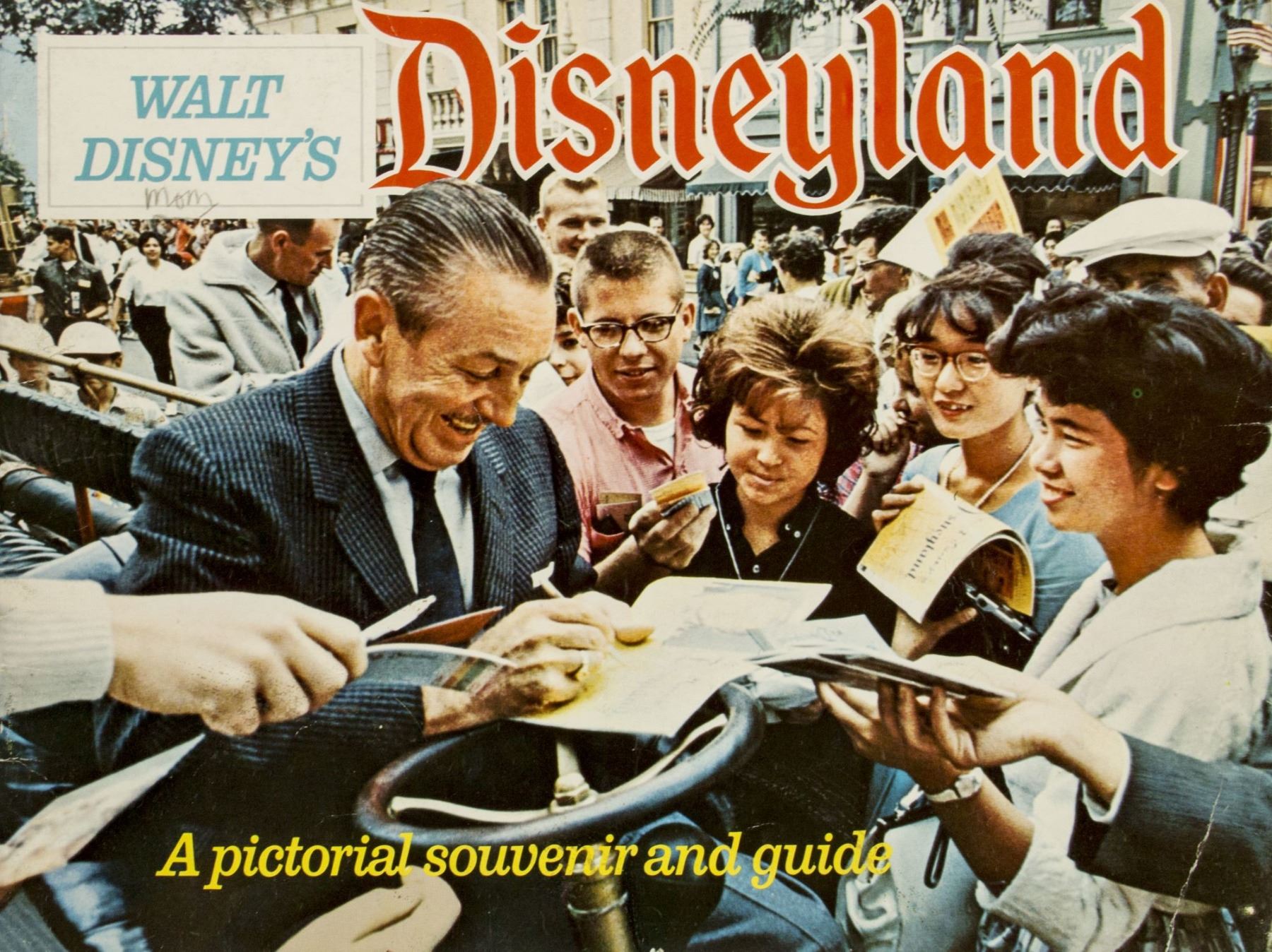(Disneyland, 1963) A pictorial souvenir guidebook with a beautiful cover photo of Walt Disney at Disneyland. This 34-page book measures 8.75"x11.5" and is in very good condition some cover-wear including the word "mom" written in pencil.