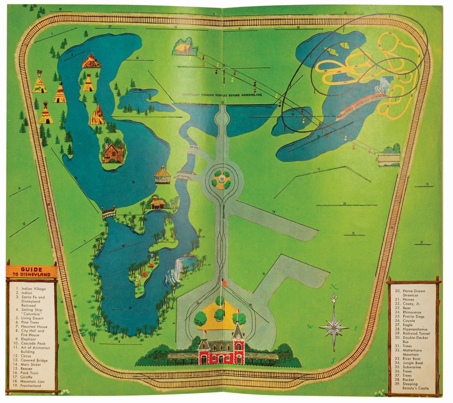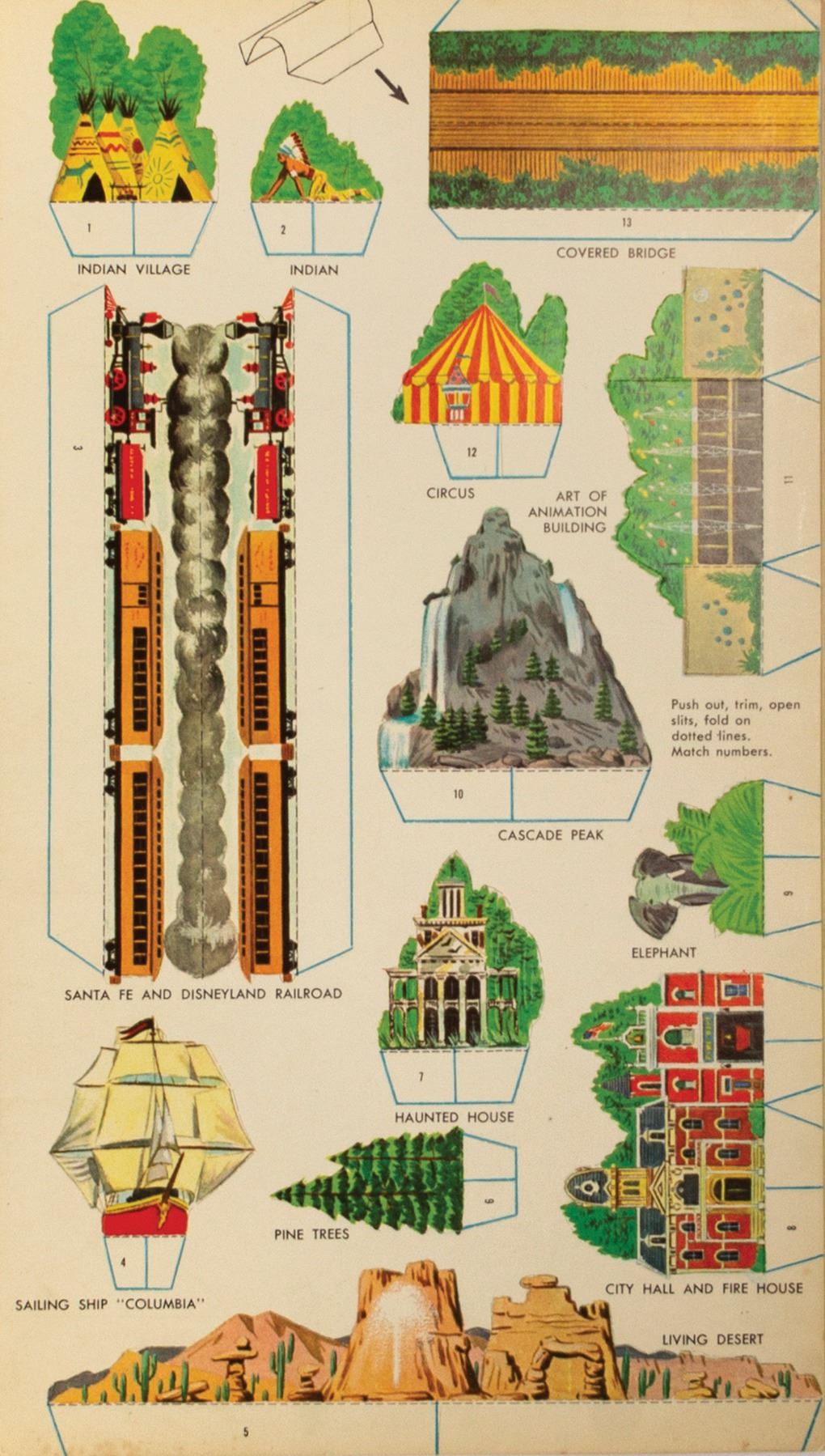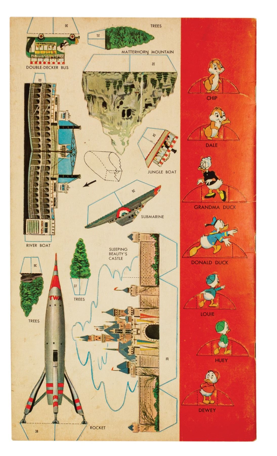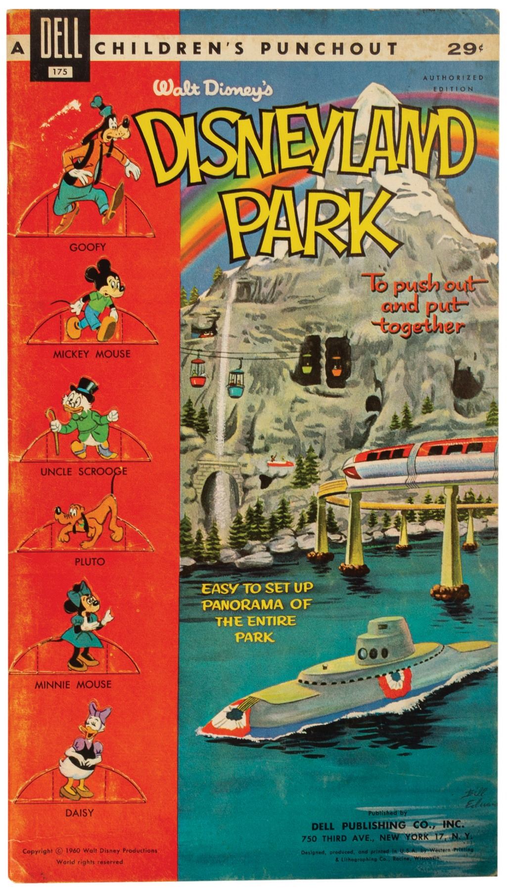 (Disneyland, 1960) A vintage children's punchout book featuring a variety of characters, attractions, and architectural features of the park. The reader could construct a diorama of Disneyland using the included pieces. Featuring 6-pages of punchouts, the 13"x7.5" book is complete and remains in good condition, exhibiting some fading to the cover's edges and general handling wear.