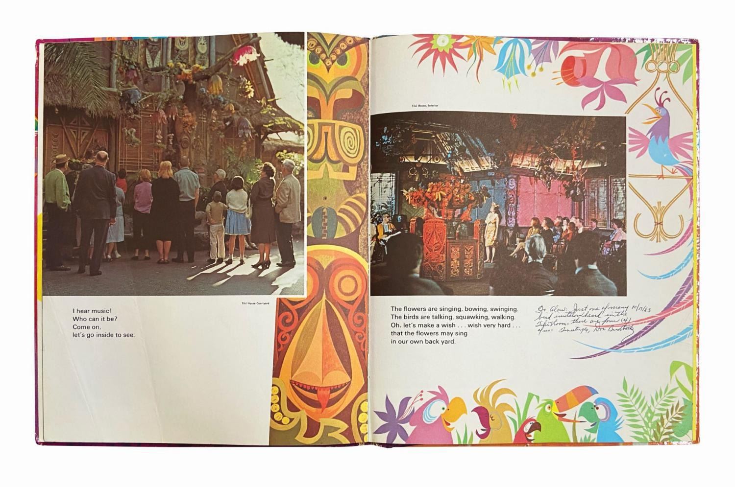 (Disneyland, 1964) A rare hardcover Whitman Giant Tell-A-Tale book titled, "Walt Disney's Disneyland." This oversized book is full of wonderful vintage photos of Disneyland in its prime. The Enchanted Tiki Room is the newest attraction featured in this book, and its page is signed by one of the bird imitators "to Alan." Measuring 12.5"x10.25", this book is in good condition with a few pen markings, scratches, and general handling wear.