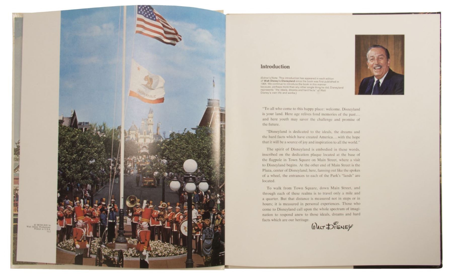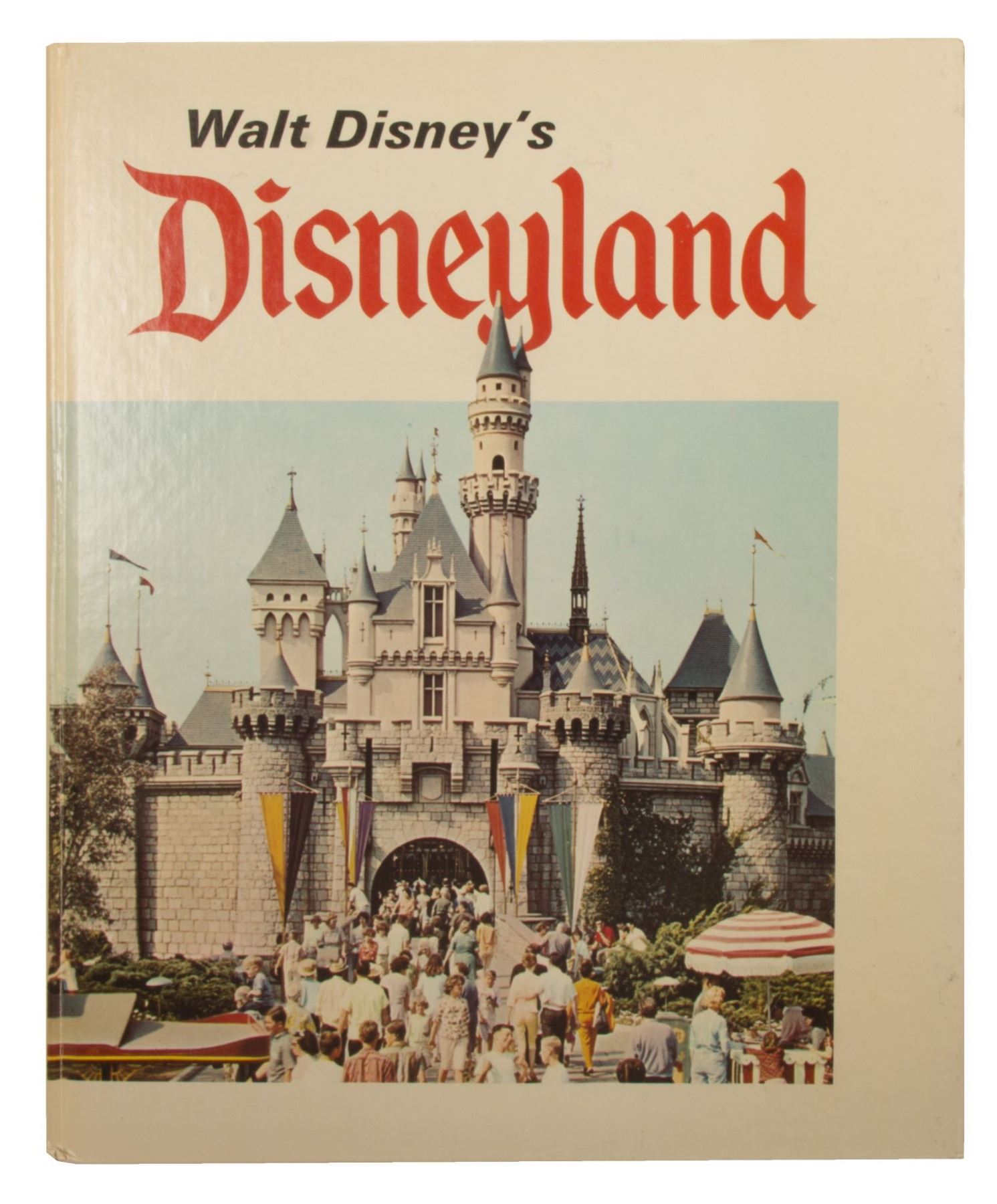 (Disneyland, 1969) A hardcover Disneyland book by Imagineer Marty Sklar featuring early photos and information on the park. Measuring 11.25"x9.5", the book is in good condition with a few spots of discoloration around the border of the cover and to a few spots within the inside pages. The corners have some edge-wear from use and there is a scratch on the spine.
