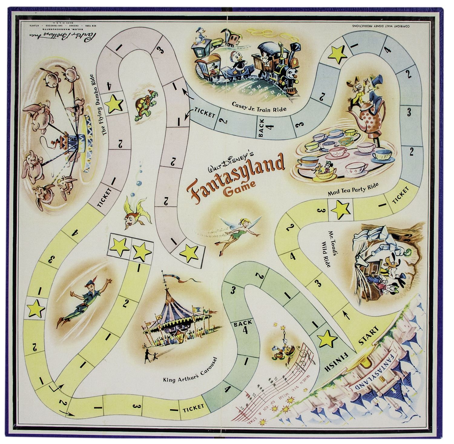 (Disneyland, 1956) A vintage "Walt Disney's Fantasyland Game" by Parker Brothers. This board game recreates the feel of Fantasyland's attractions and characters. The game includes the board, four player tokens, 24 ride tickets, 23 movement stars, a reproduction instructional sheet, and the game box. All of the components to still play are included. The box measures 8"x16" and 2" thick, and the game is in good condition overall with some minor wear to the box lid.