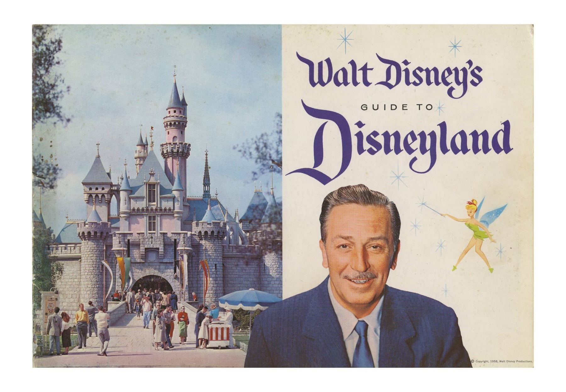 (Disneyland, 1958) An early guidebook featuring Walt Disney and Sleeping Beauty Castle on the cover. Created as a complete guide to Disneyland, the book contains color photos of the different lands and attractions of the park, an early illustrated park map, and details on coming attractions. This 27-page book measures 8"x11.5" and is in very good condition with some wear around the border.