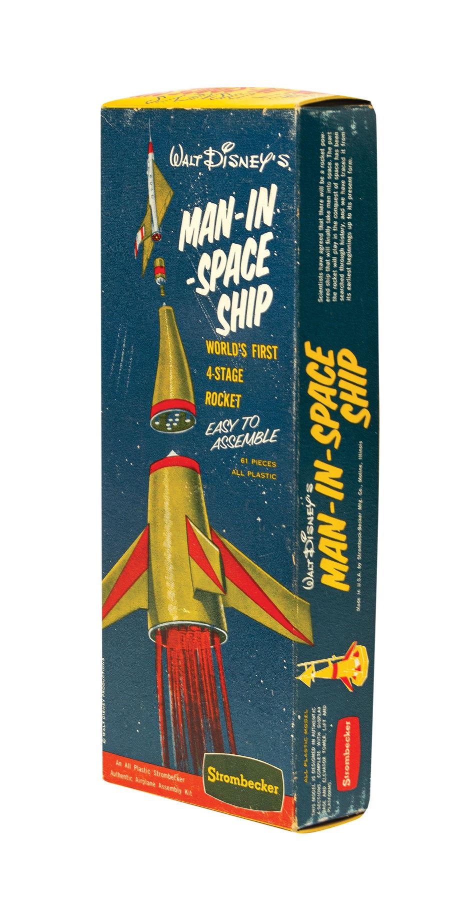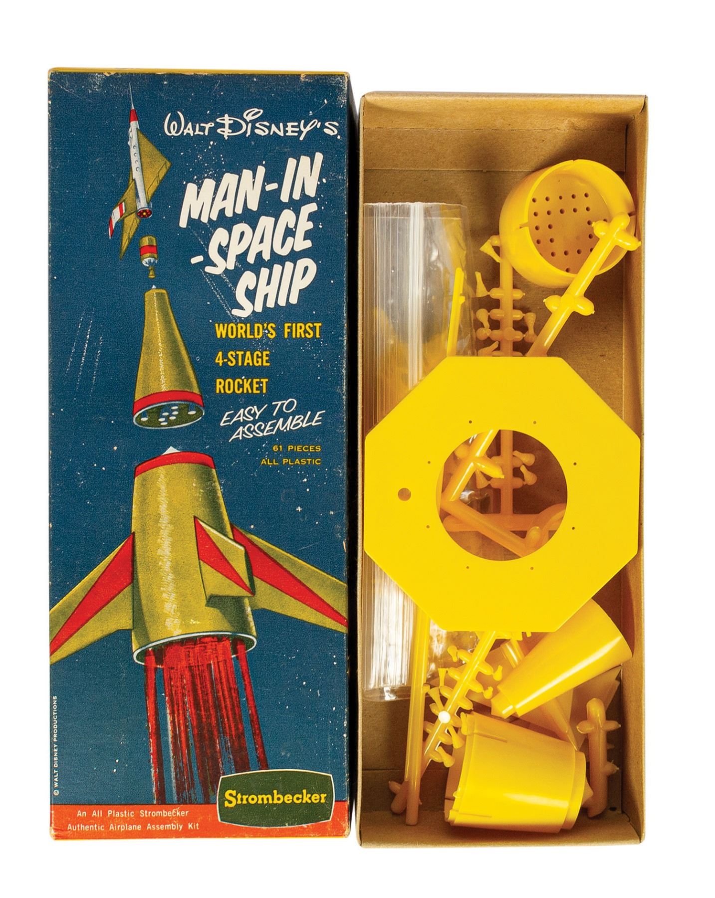 (Disney, 1950s) A vintage Walt Disney’s Man-in-Space ship model rocket kit manufactured by Strombecker. The 61-piece plastic 1/480 scale model of the world’s first 4-stage rocket is complete and includes a sheet of decals. Some plastic pieces are still connected to their runners. The original box is present and measures 11”x4.25 and 2” deep. The box is in very good condition, exhibiting some edge wear, indentations, and tape residue to bottom. The unassembled model exhibits only minor handling.
