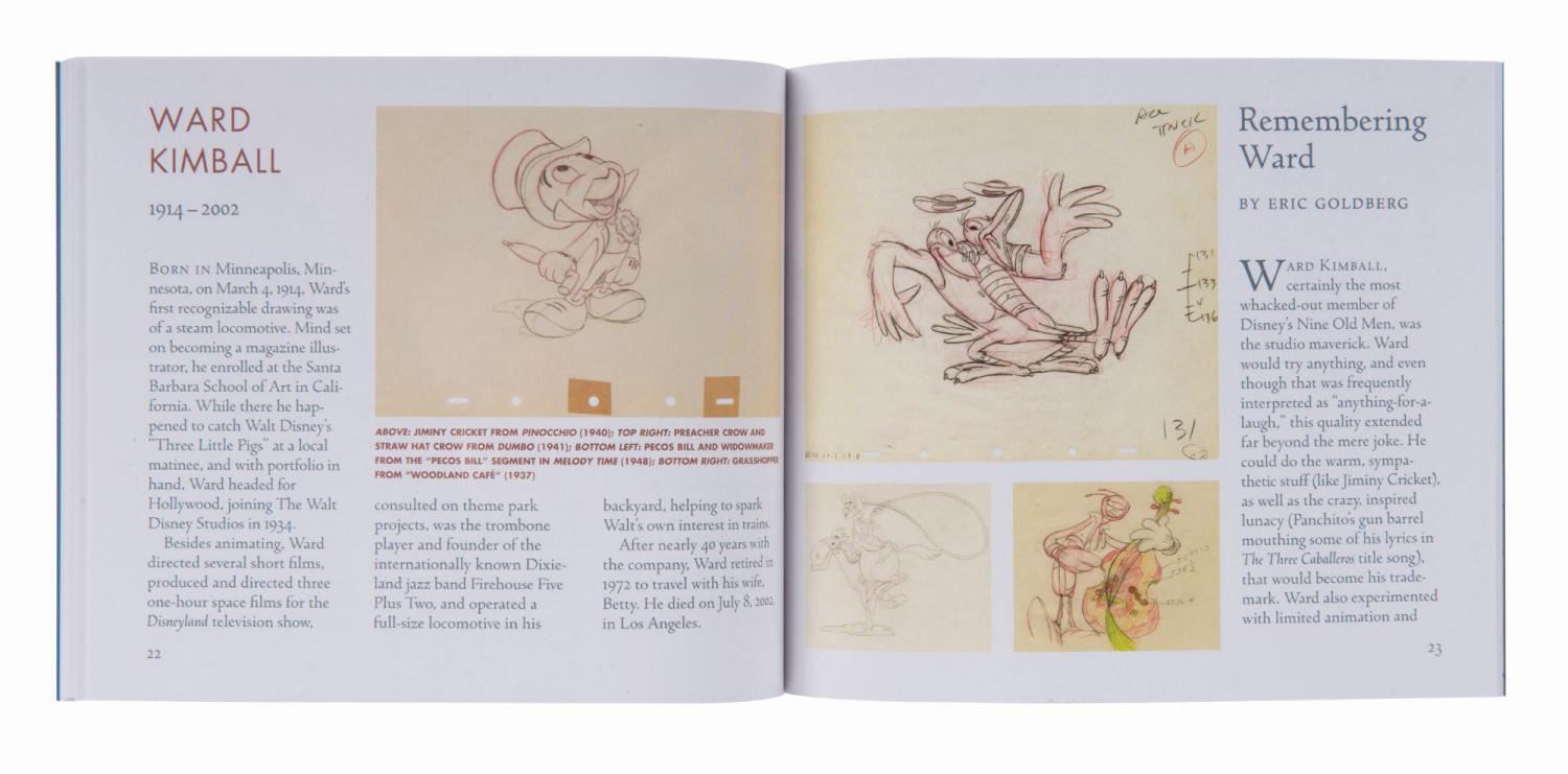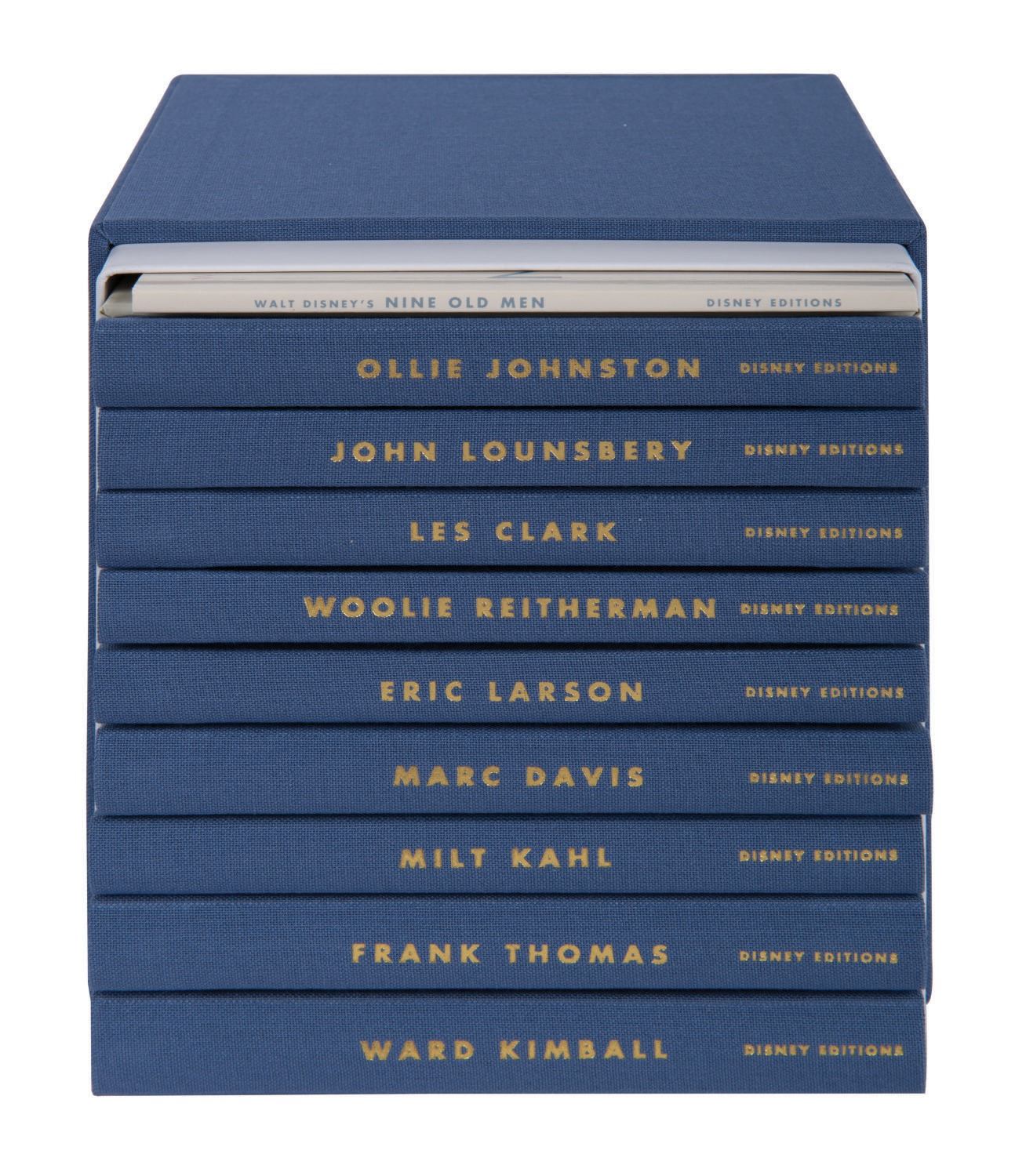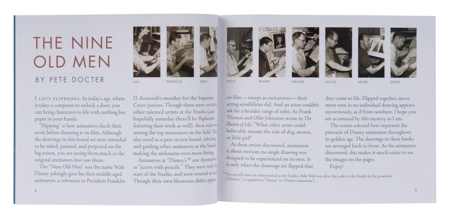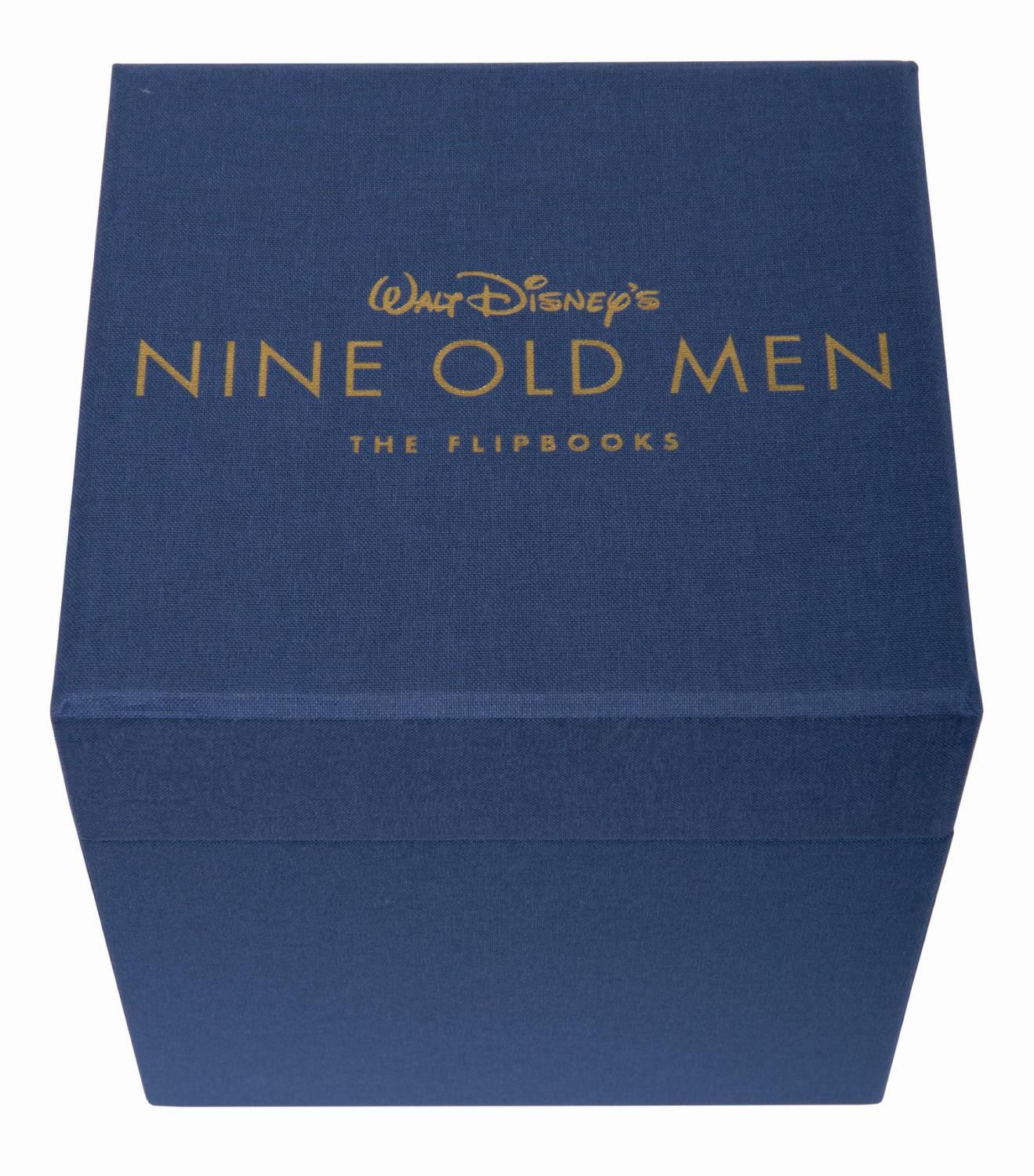 (Disney, 2012) A boxed set of (9) hardcover flipbooks edited by Pete Docter and released by Disney Editions. Each book spotlights artwork by one of Walt Disney's "Nine Old Men" - Les Clark, Eric Larsen, Frank Thomas, John Lounsbery, Ward Kimball, Ollie Johnston, Marc Davis, Wolfgang Reitherman, and Milt Kahl. The flipbooks consist of the sequential animation drawings for scenes from classic Disney films. An additional softcover volume of the artists' biography is also included. Measuring 5.25"x6.25", the flipbooks are in very fine condition, housed in a lidded cloth and board box, embossed with the Disney Edition's title. Measuring 6.25"x6.75" and 5.75" deep, the boxes are in very fine condition, in original shrink-wrapping.