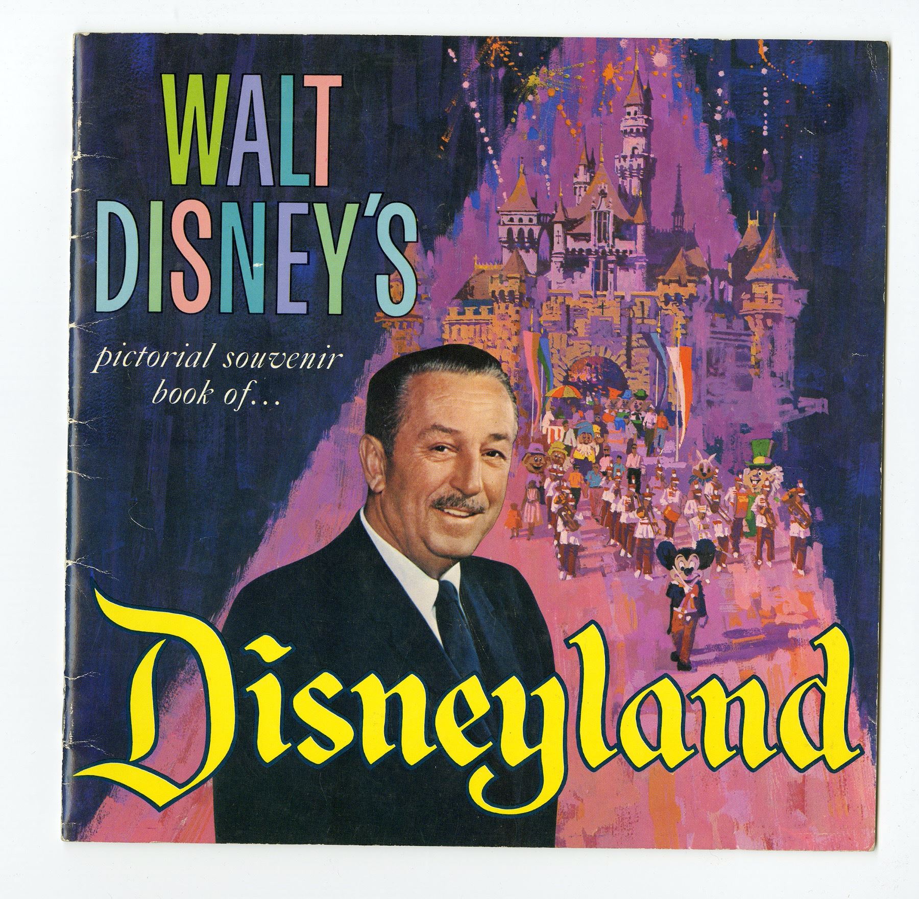 (Disneyland, 1965) A pictorial souvenir book from 1965 featuring Walt Disney and Sleeping Beauty Castle on the cover. Depicted inside is a visual walkthrough of the park’s attractions and history. Created in full-color, this book features artistic framing and design that highlights the beautiful park photos within. The 32-page book measures 10.5â€x10.5†and is in good condition with some wear to the spine from previous use.