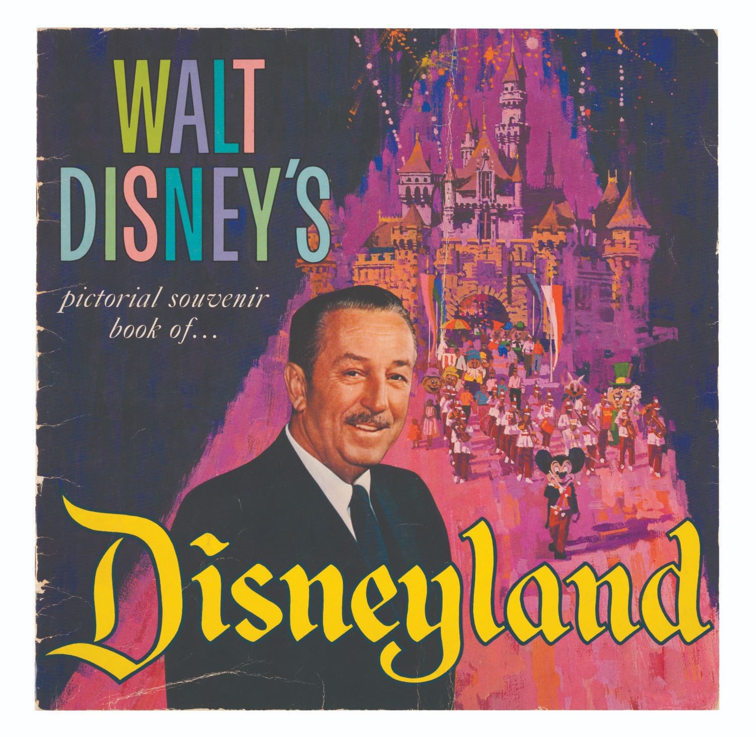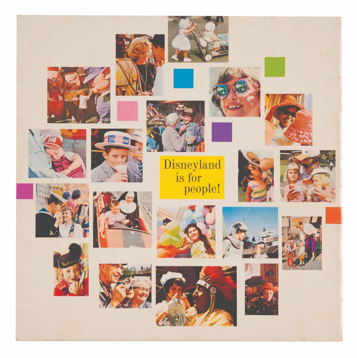 (Disneyland, 1965) A pictorial souvenir book of Disneyland. In full-color, this book provides a visual walkthrough of the Park's attractions and history. Recently added attractions featured include the Enchanted Tiki Room and It's a Small World. Future attractions such as the Haunted Mansion are also described. The 32-page book measures 10.5"x10.5" and is in overall good condition, with wear to the cover including creases at the spine, and a slight vertical crease just right of center.