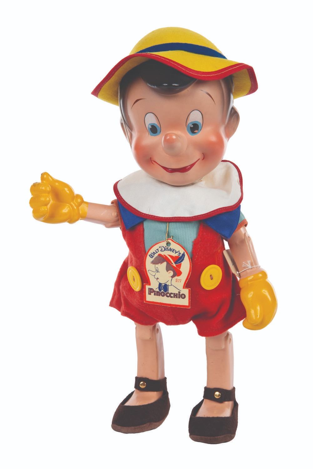 (Knickerbocker, 1939) A Pinocchio doll by renowned Knickerbocker Toy Company, Inc. of New York produced right before the Disney film's release. The doll has hand-painted facial features and real cloth hat, shirt, and trousers, and shoes. Measuring 13.5" tall and 6" at its widest diameter, the figure displays in fine condition, retaining an original label, and exhibiting only the slightest wear.