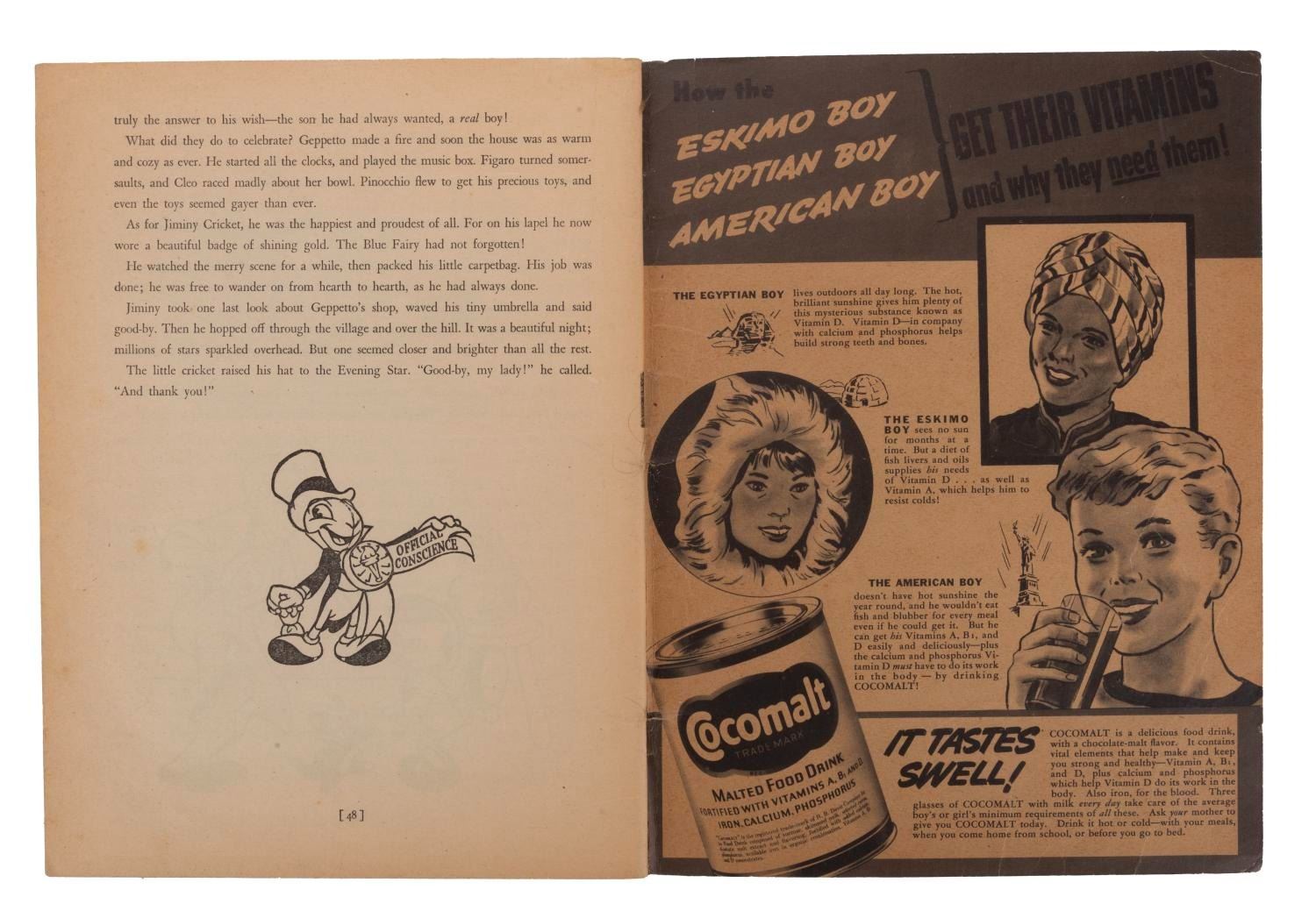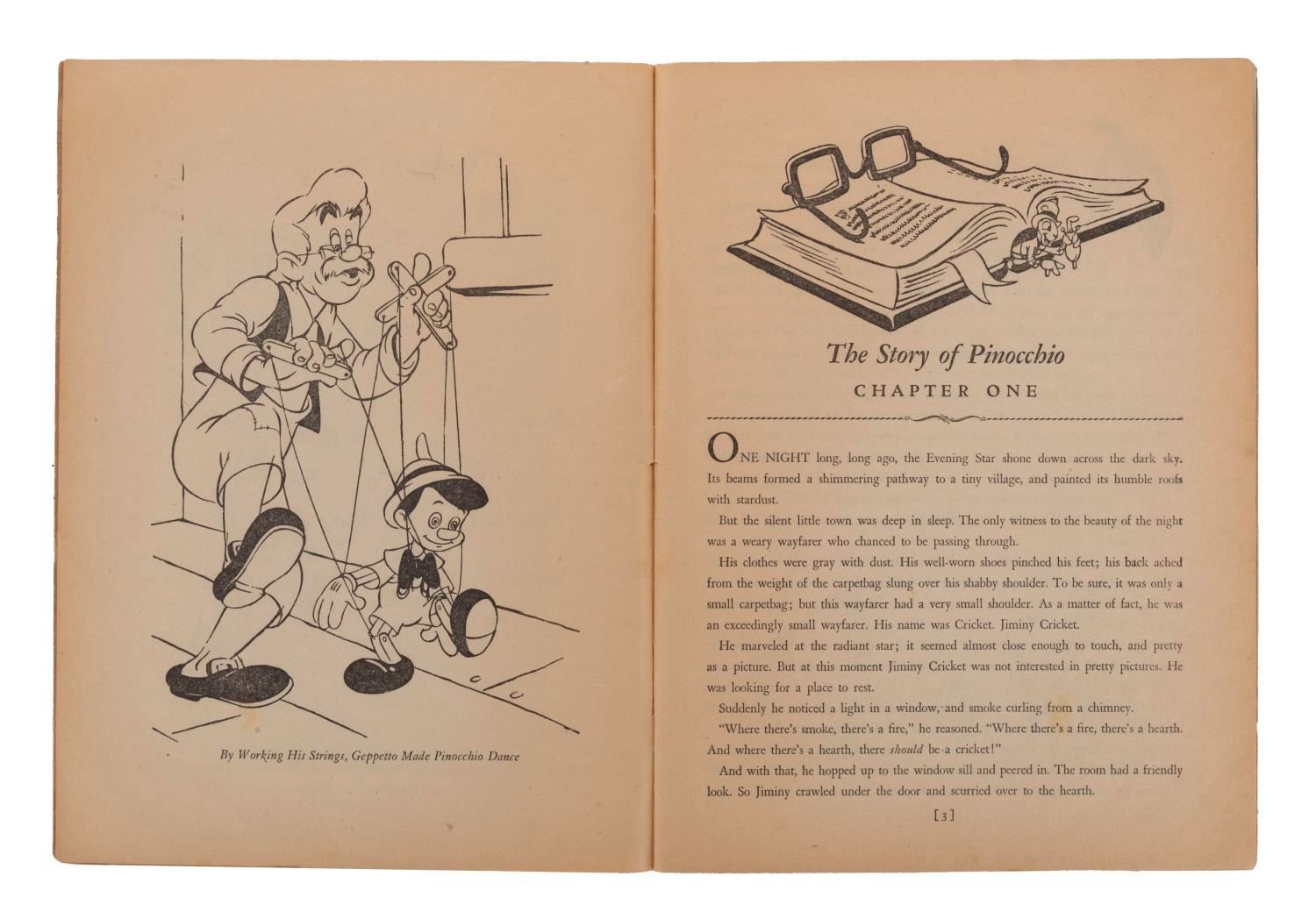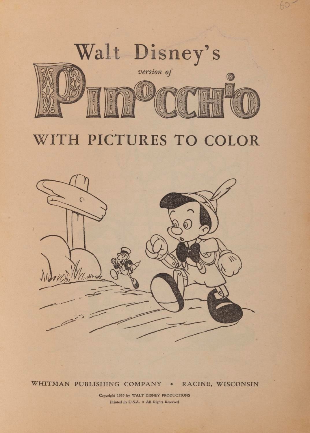 (Whitman, 1939) A "Walt Disney's Pinocchio With Pictures to Color" book. Measuring 8.5" x 11.5", this 48-page book is in good uncolored condition, with creases and wear to edges and corners.