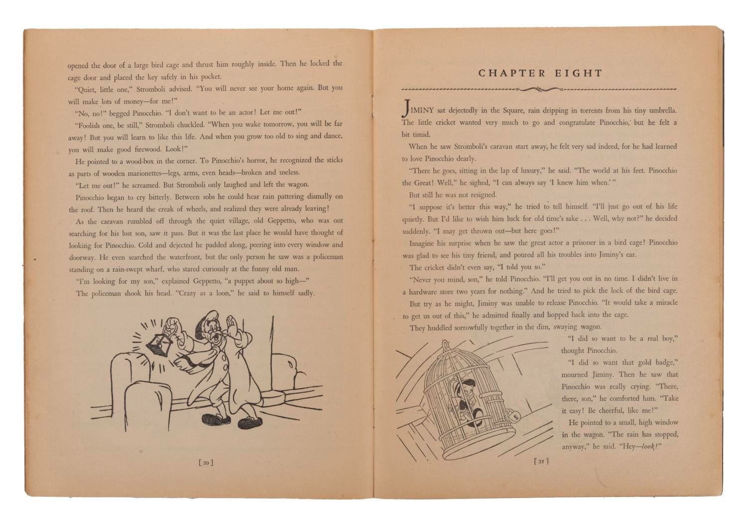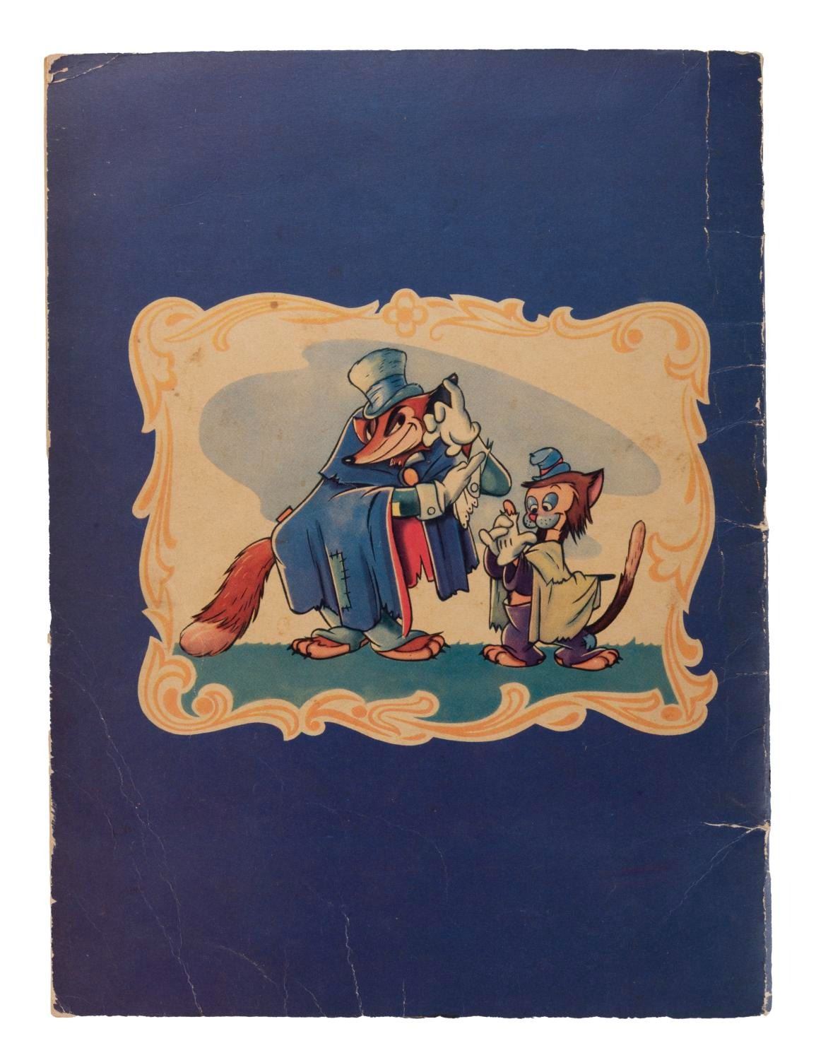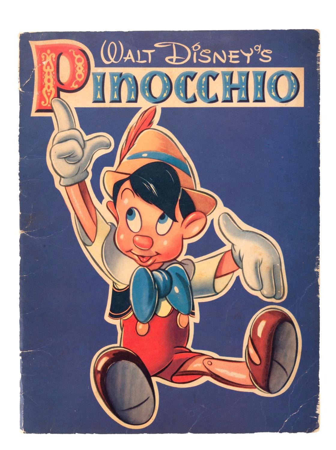 (Whitman, 1939) A "Walt Disney's Pinocchio With Pictures to Color" book. Measuring 8.5" x 11.5", this 48-page book is in good uncolored condition, with creases and wear to edges and corners.