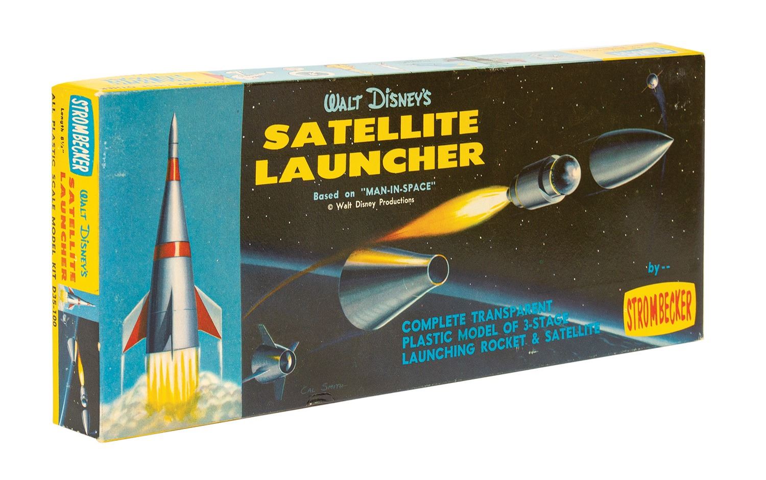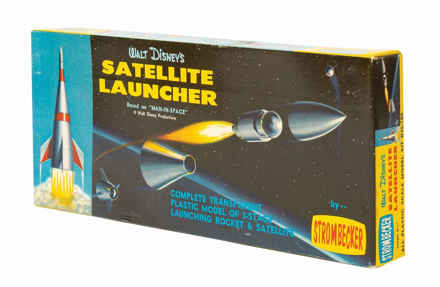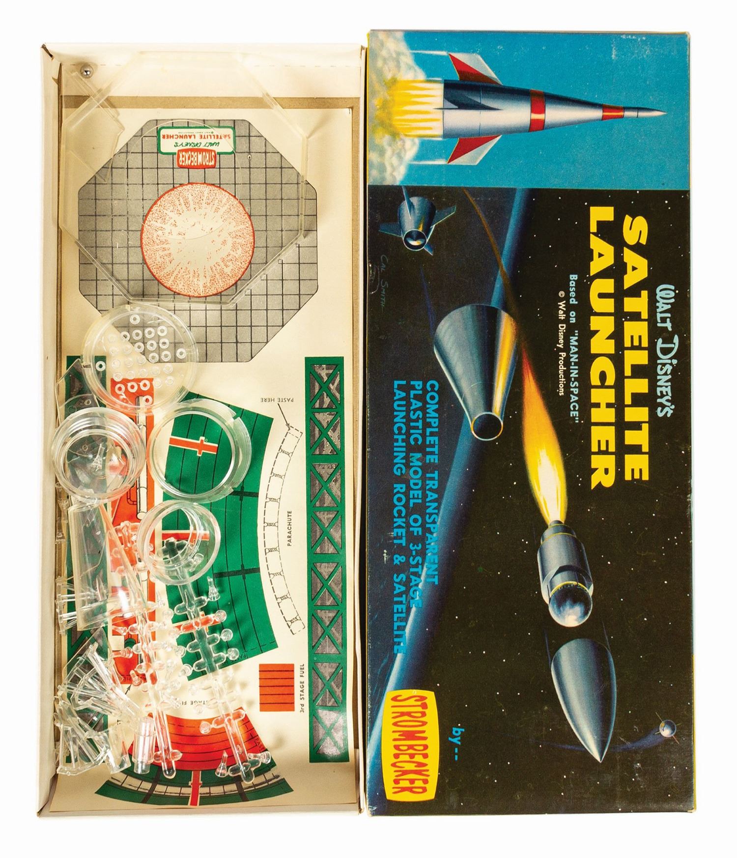 (Disney, 1950s) A vintage Walt Disney’s Satellite Launcher model rocket kit manufactured by Strombecker. The transparent plastic model was inspired by theoretical designs featured in Walt Disney's Man in Space, Man and the Moon, and Mars and Beyond. This 1/480 scale model kit is complete, with some plastic pieces still attached to their runners. It includes a sheet of decals and the original instruction manual. All items are assembled in the original box, which features retro-futuristic concept artwork and practical scientific diagrams. The box measures 5”x12” and 1.5” deep and is in very good condition. It exhibits minor wear to the corners and stains from a strip of tape on both sides of the lid and bottom of the base. The model components exhibit only minor wear.