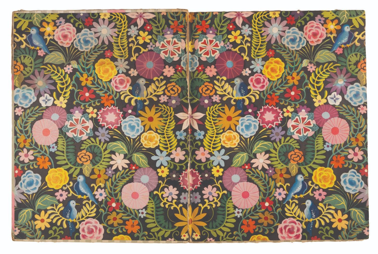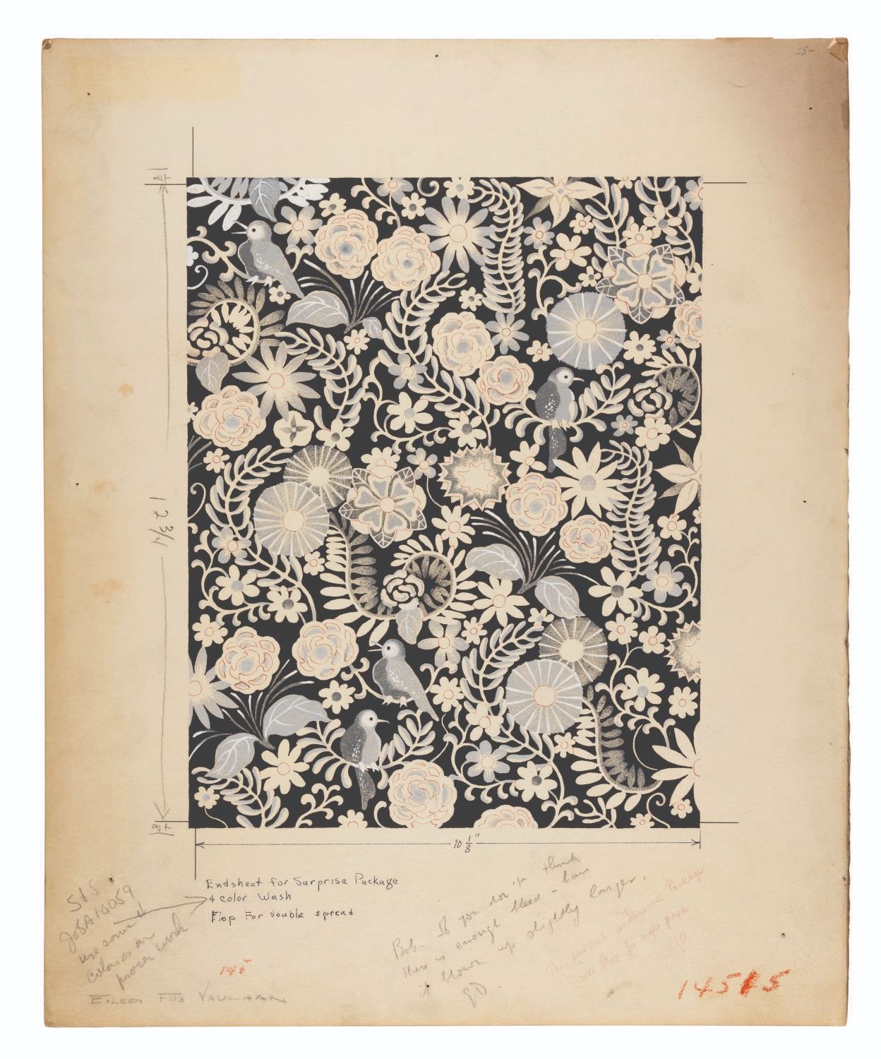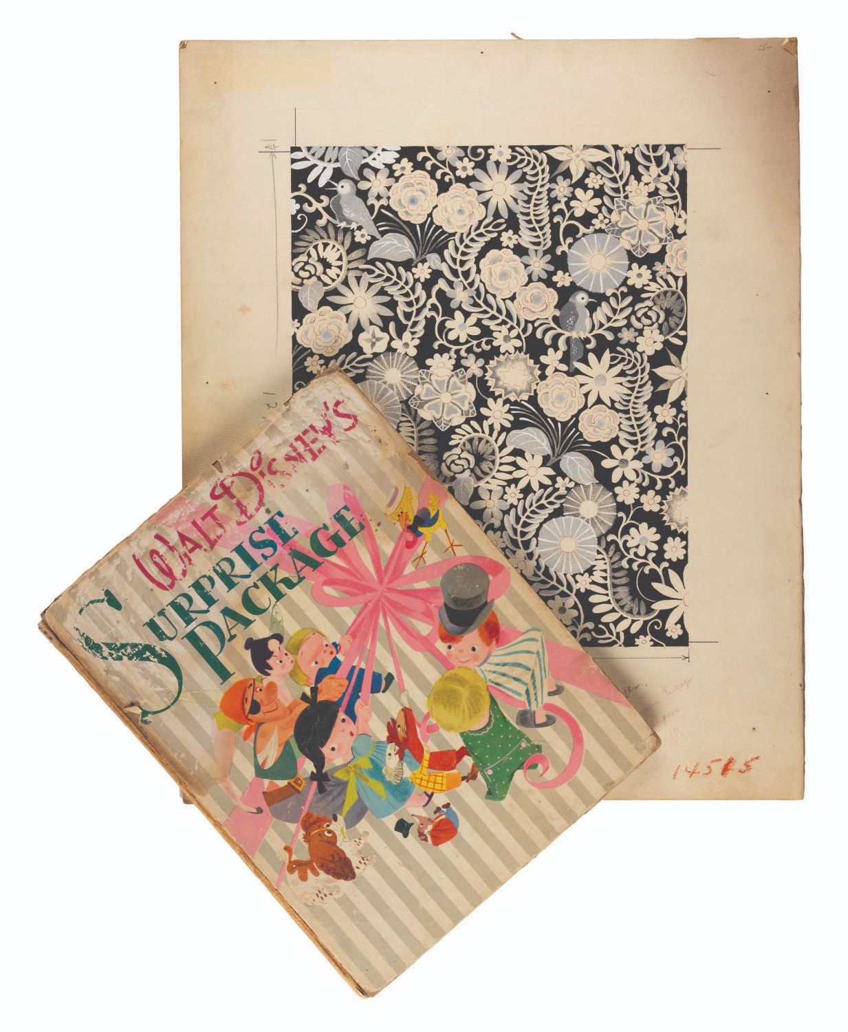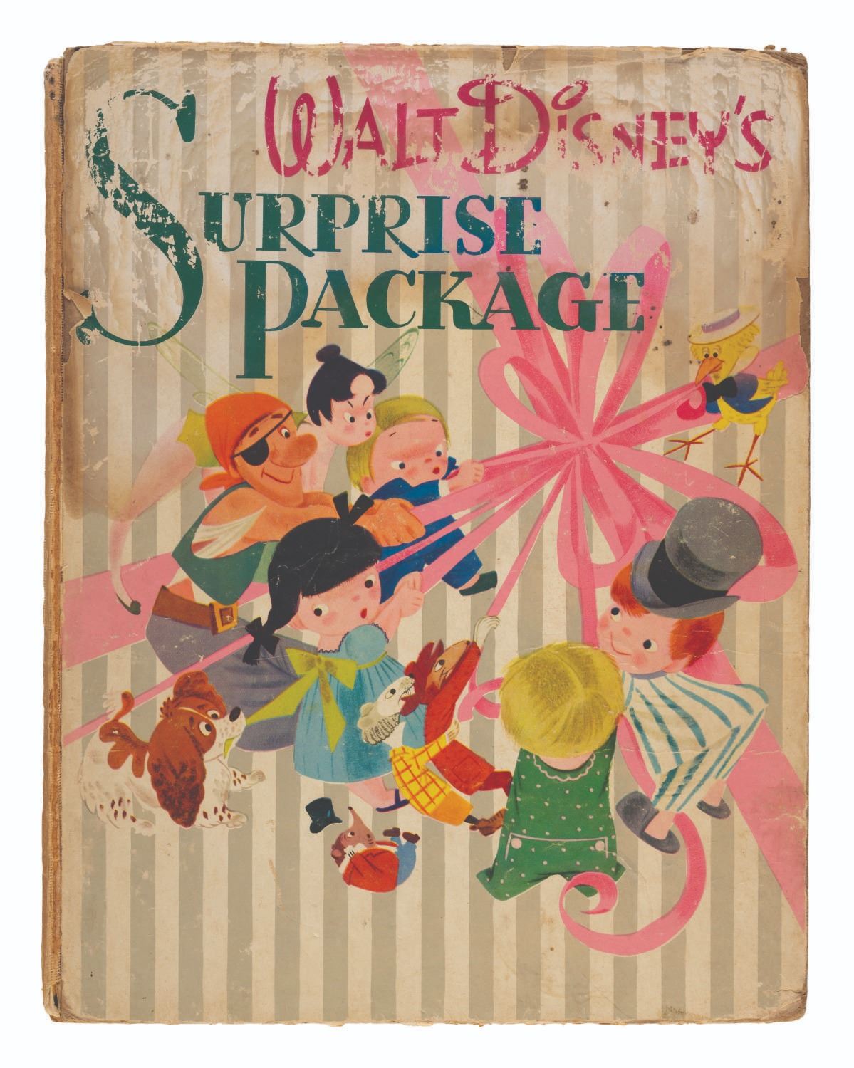 (Disney, 1944) Beautiful original artwork used for the endpapers of the 1944 Simon And Schuster book, "Walt Disney's Surprise Package." Accomplished in ink, gouache and graphite, the image measures 10"x13" on 16"x20" artists' board. The artwork is in very good condition with toning and light damage to the edges of the board. Hand-written notations for the printer are visible along the bottom of the board along with the signature of the artist, Eileen Fox Vaughn. The artwork is accompanied by a fair condition copy of the book for reference.