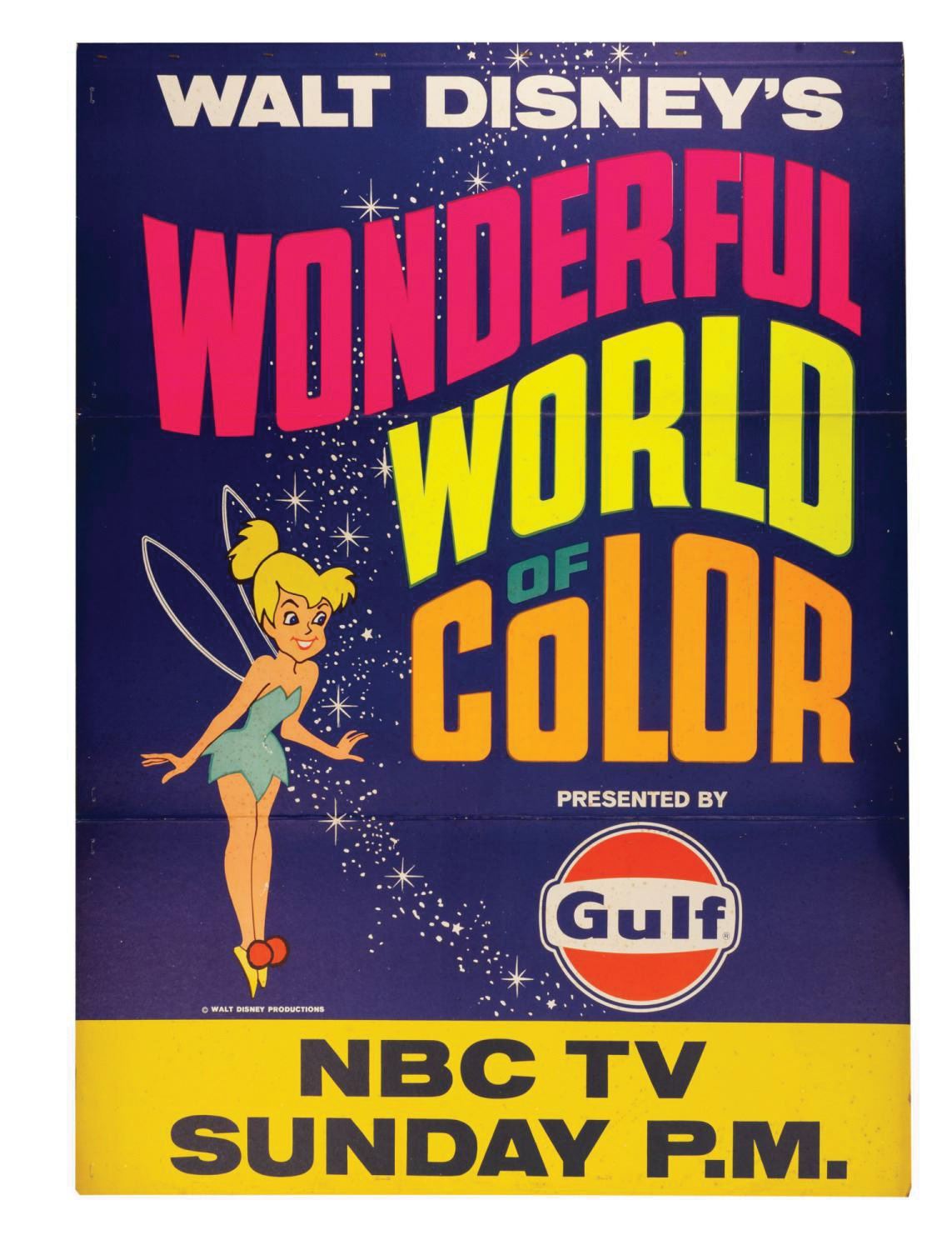 (Disney, c.1960s) A large advertisement poster for Walt Disney's Wonderful World of Color presented by Gulf Oil. The silkscreened advertisement is printed on sturdy board and features a charming image of Tinker Bell. Measuring 60"x44", it is in good condition, exhibiting some spots of discoloration, scuffs, scratches, and wear from display.