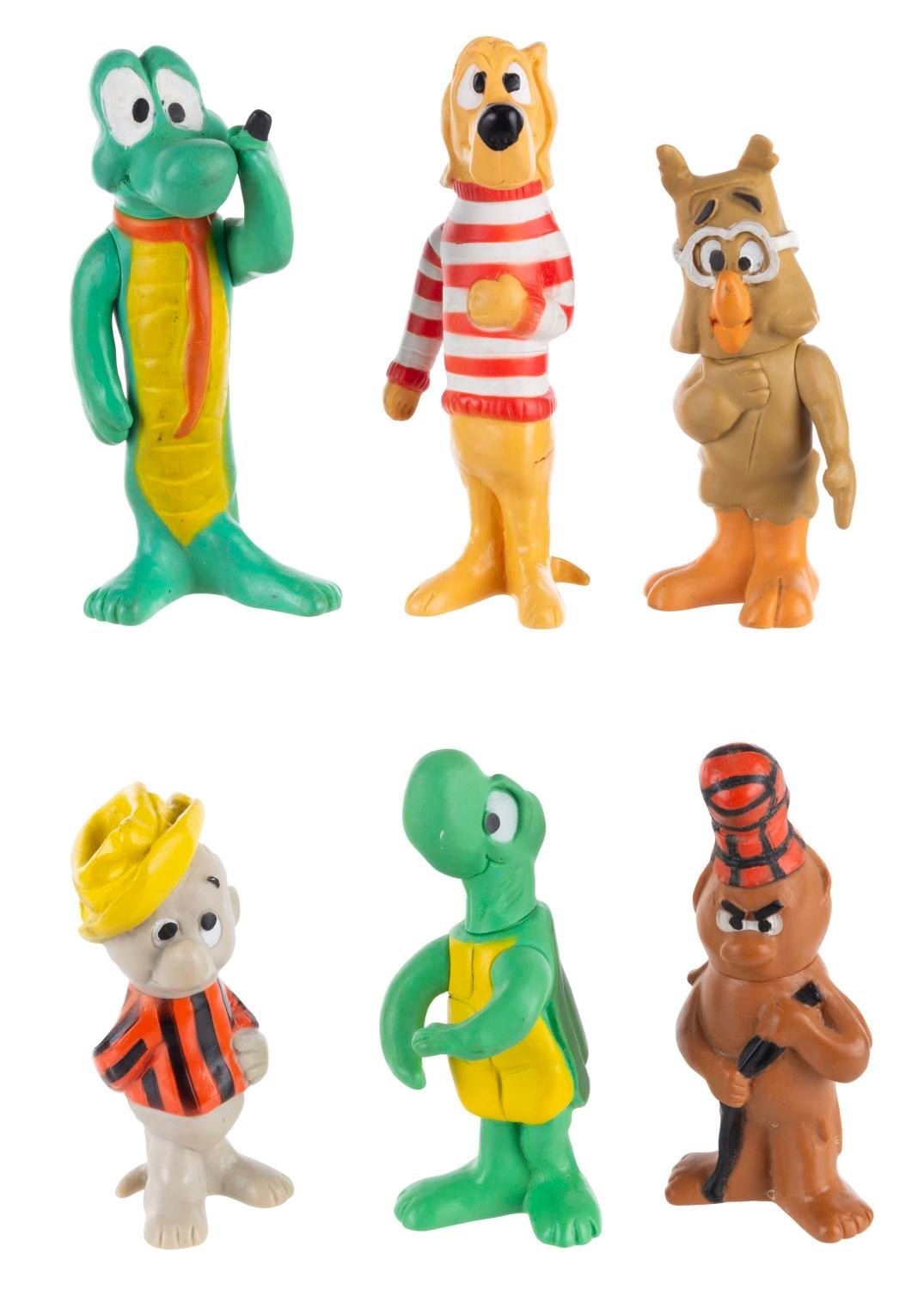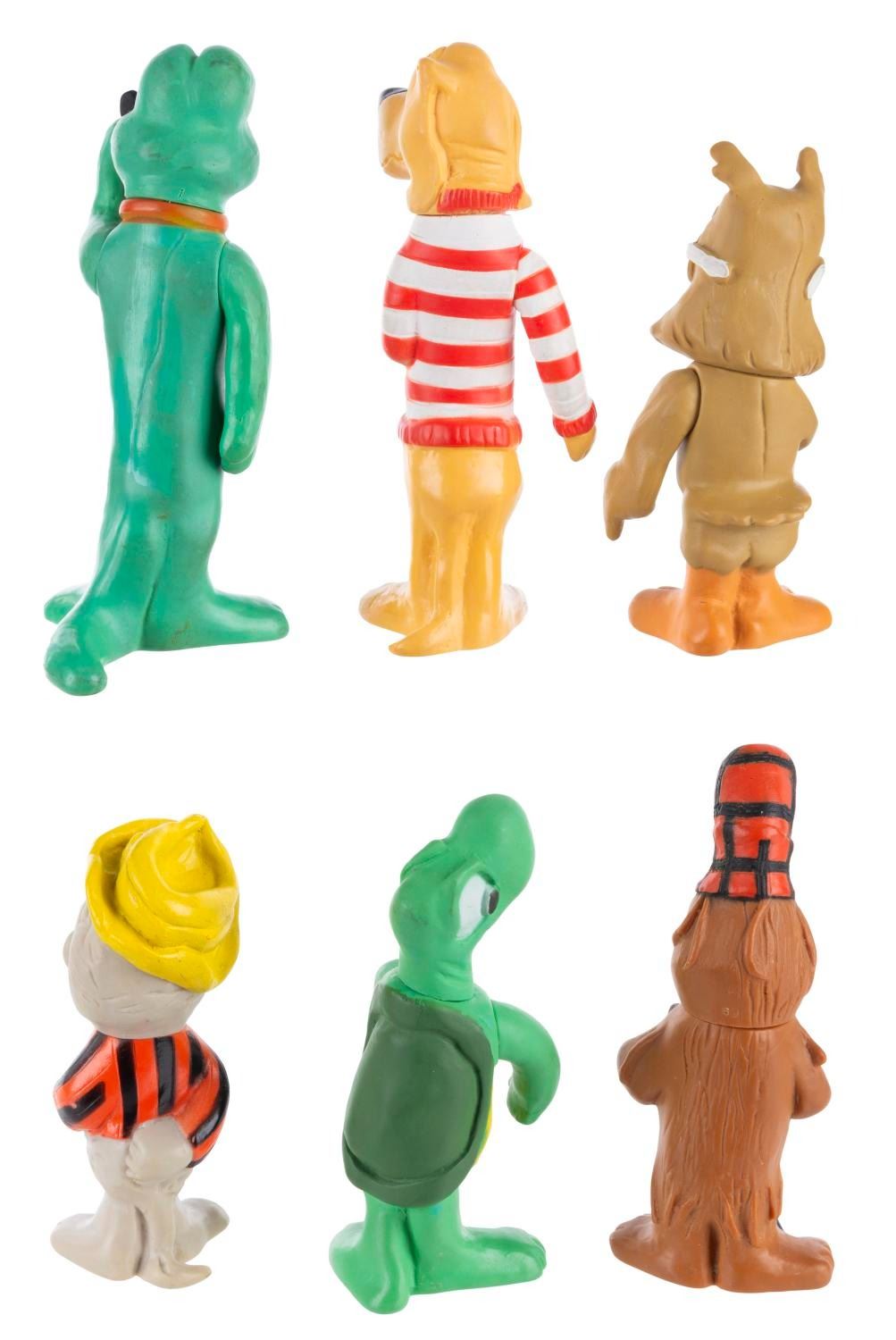 (Procter & Gamble, 1969) A complete set of six Pogo character figures, originally available with the purchase of Procter & Gamble products in 1969, The set includes Pogo Possum, Churchy la Femme, Howland Owl, Beauregard Hound, Albert Alligator and Porky Pine. Standing from 4” to 5.5” tall, the vinyl figures are in very good condition, with some scuffs and small spots of stray paint from original production.