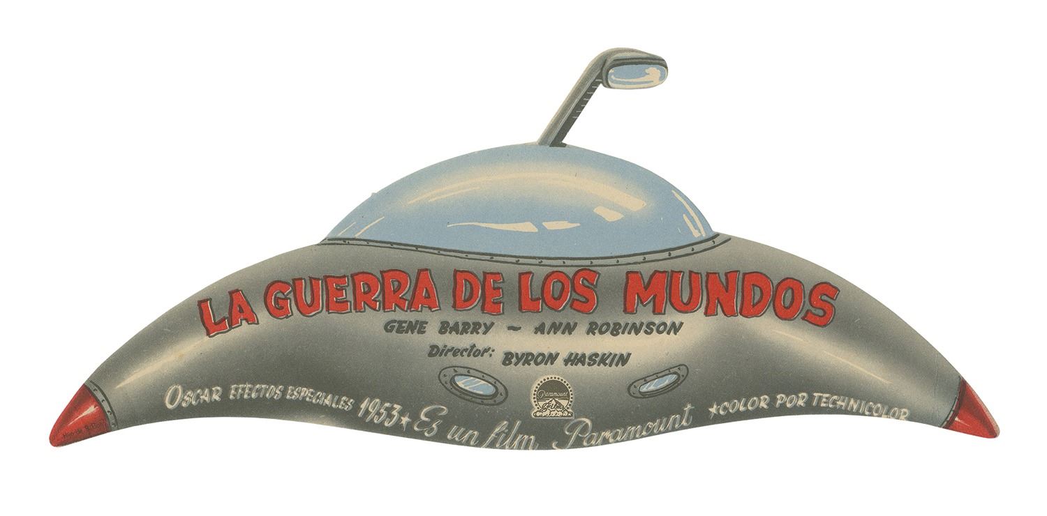 (Paramount, c.1970s) A rare War of the Worlds herald card from the Spanish re-release of the iconic sci-fi film. These types of cards would be handed out as promos for the film, with this card beautifully die-cut into the shape of one of the Martian War Machines. Measuring 4"x9", the herald card is in good condition with minor surface wear from use.
