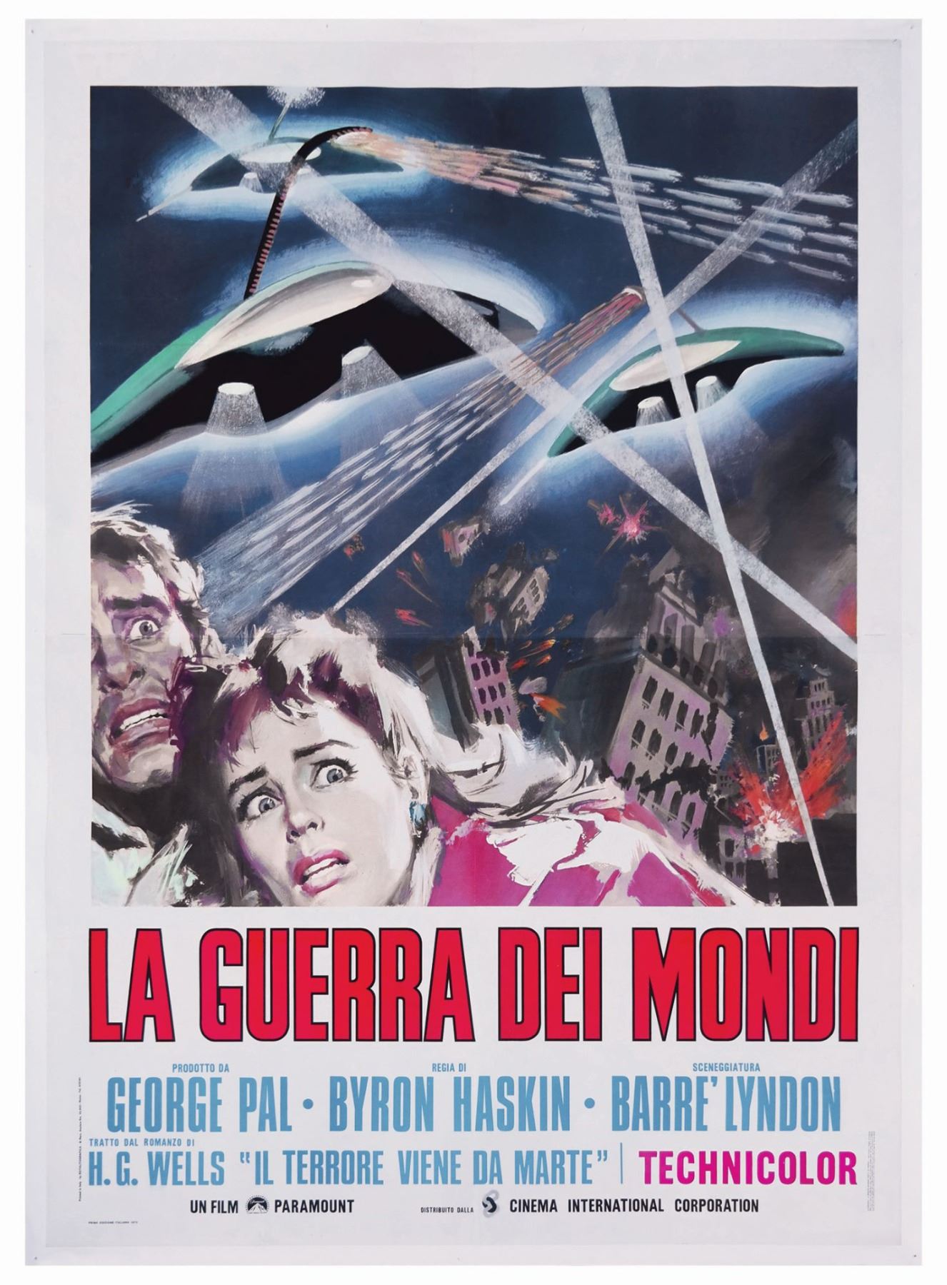 (Paramount, 1973) A rare Italian four sheet poster for the theatrical re-release of The War of the Worlds. This science fiction classic was a critical and commercial success, and the eye-catching visuals of this poster wonderfully represent the excitement of the film. Measuring an impressive 78"x55", the poster is in good condition overall with some surface wear from use, including some color wear and small creases in the areas where the individual sheets connect. There have been some areas of restoration throughout, and the poster has been linen-backed for its preservation.
