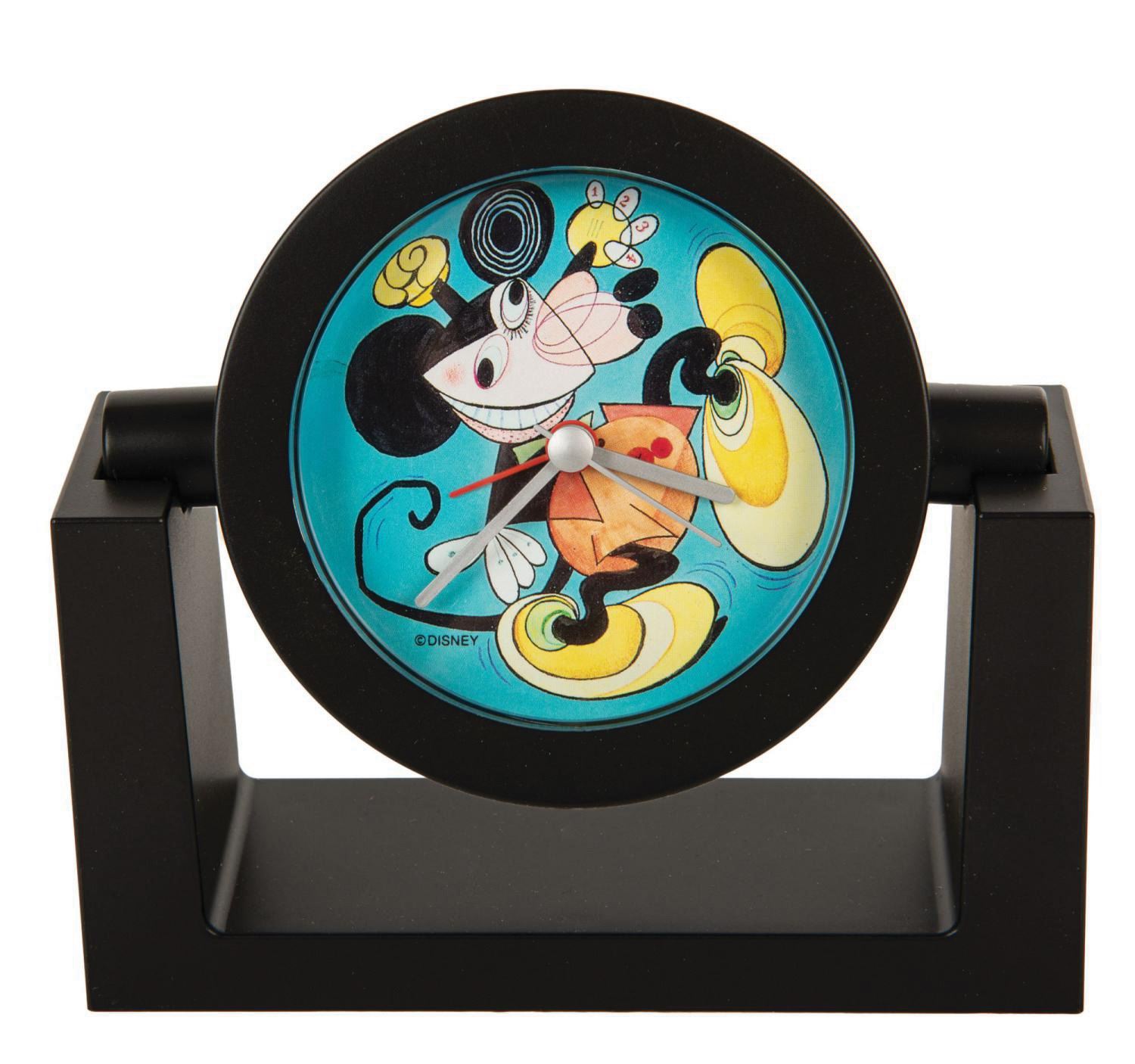(Disneyland, c.1990s) A stylized Mickey Mouse clock by Disney Legend Ward Kimball. Kimball's "innovative" late 1970s recreation of Mickey Mouse in homage to the abstract styling of Pablo Picasso is the face of a modern limited release timepiece by Centric. The graphic was initially created for "The Art of Mickey Mouse" by Ward Kimball. Measuring 5.25"x4.75" and 1.5" wide, the black eggshell clock case and swivel mount are in fine condition, retaining original Walt Disney Gallery sticker on base and warranty tag, which exhibits some creasing.