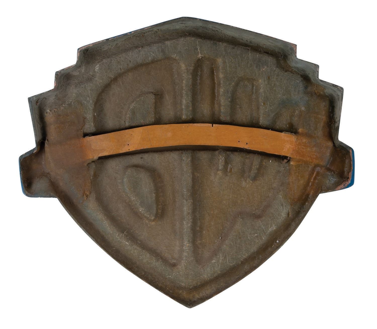 (Warner Brothers, c.1991) A Warner Brothers Studio Store Sign featuring the corporate "WB" emblem. Signs like this one were a constant feature of the popular retail chain's decor and motif for a decade. Measuring 23" tall and 26.5" wide, the durable fiberglass and wood sign displays in very good condition exhibiting some scuffs, scratches and wear to the patina of the paint.
