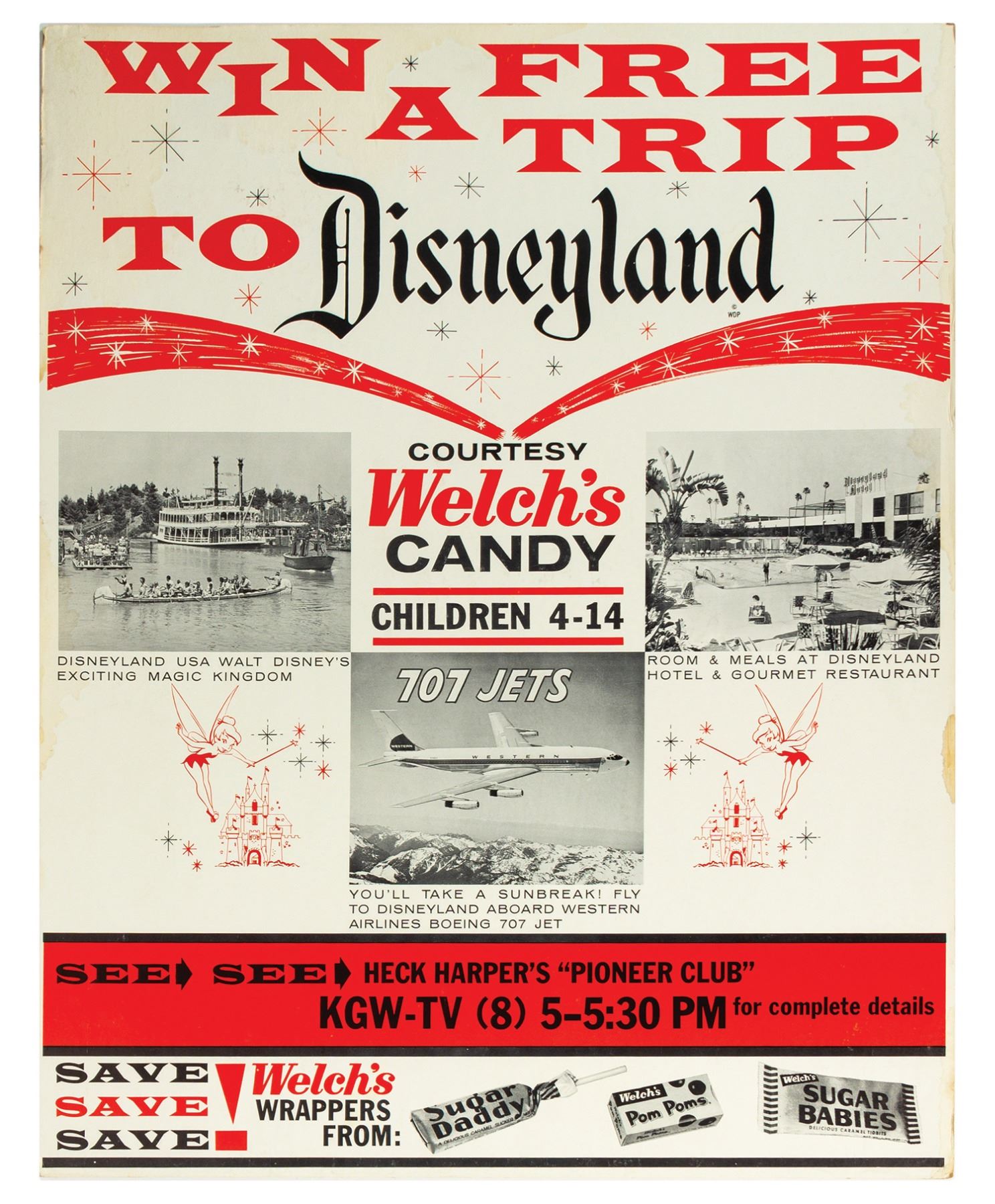 (Disneyland, c.1957) A promotional contest poster created for Welch's Candies, offering a chance to win a free trip to Disneyland. The poster includes several early photos of Disneyland and the Disneyland Hotel, and mentions that Heck Harper's Pioneer Club TV show would feature the contest details. Measuring 28"x22" on art board, the poster is in fair condition with some moisture staining along the top and edges, and some general wear throughout from use.
