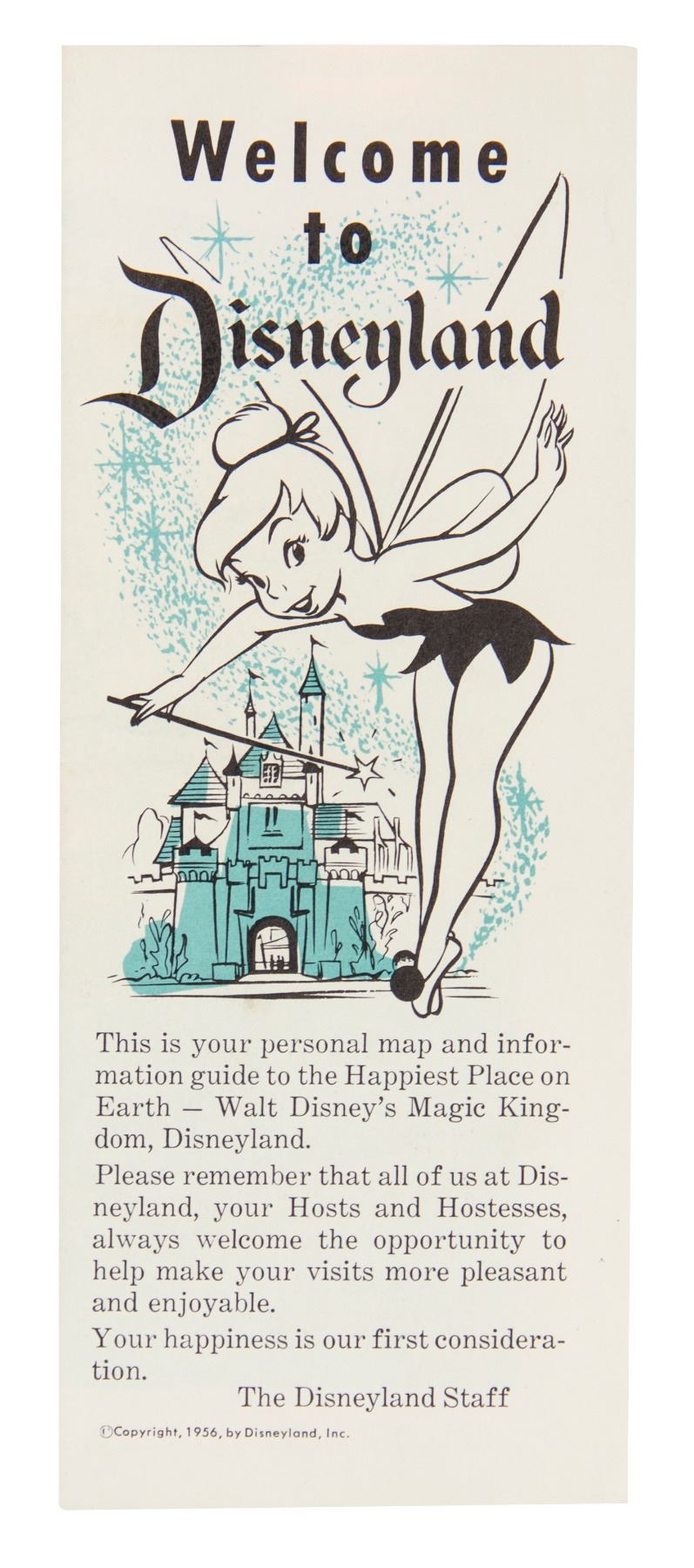 (Disneyland, 1956) A beautiful gate fold-out featuring Tinker Bell on the cover and a map of Disneyland on the inside. This fold-out includes information on restaurants and other attractions in the park from 1956. The fold-out measures 9"x3.5†and is in very good condition.