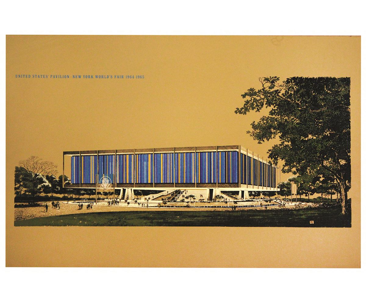 (New York World’s Fair, 1963) Stunning silk-screened poster made as gifts to World’s Fair, Disney, and General Electric executives, featuring a conceptual rendering of the American Pavilion at the fair. Hand silk-screened on 26.5” x 40” thick rag paper, the piece is in fine condition with very little wear.