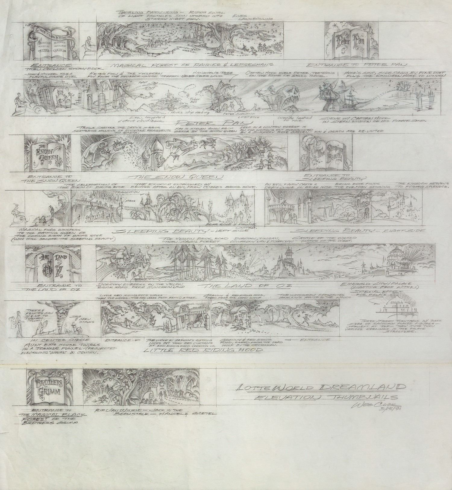 (Goddard Group, 1991) A beautiful collection of elevation thumbnail drawings by Wes Cook for Lotte World. The drawing was created for an attraction called Dreamland which was never built, and the elevation thumbnails include scenes from classic fairy tales like Peter Pan, Sleeping Beauty, The Snow Queen, Jack and the Beanstalk, Little Red Riding Hood, and even The Wizard of Oz. Measuring 24.75"x24", the pencil drawing is in good to very good condition with some bending/creasing throughout from age and use. There are also several small tears along the edges, including one which has been repaired with tape. The drawing is comprised of two sheets which have been taped together, so there is a line of tape above the bottom panels.