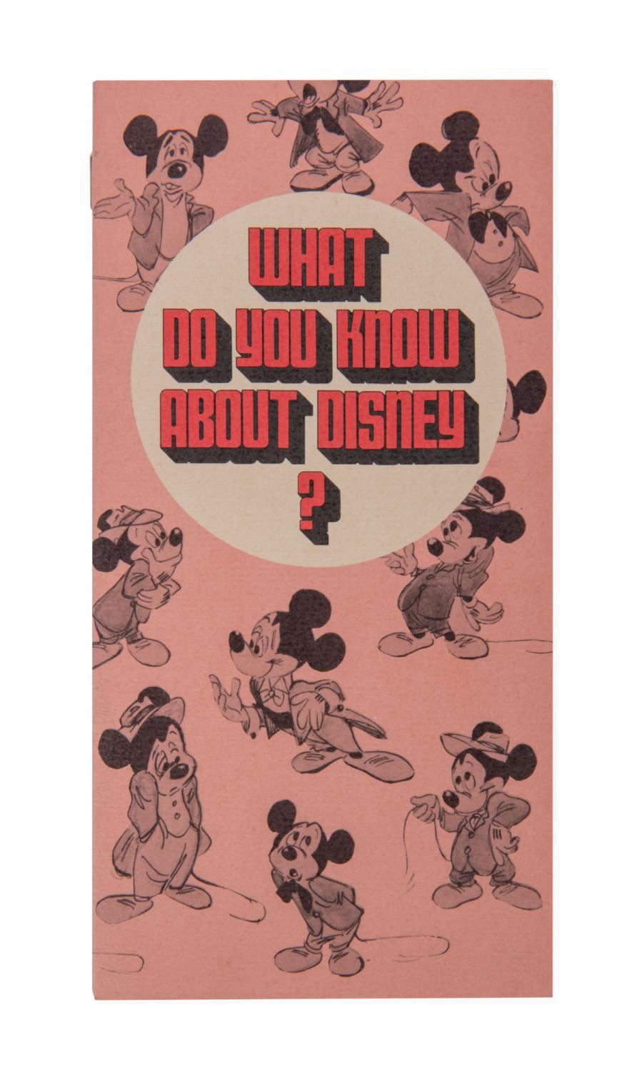 (Disney, 1972) A "What Do You Know About Disney?" brochure. Keynoting the "Disney Ideals," the illustrated handout was designed to pass Walt's values to those submitting portfolios to join the creative team responsible for researching and developing the story, layout, backgrounds, and animation involved in Walt Disney Productions. Measuring 8"x4", the booklet is in very fine condition.