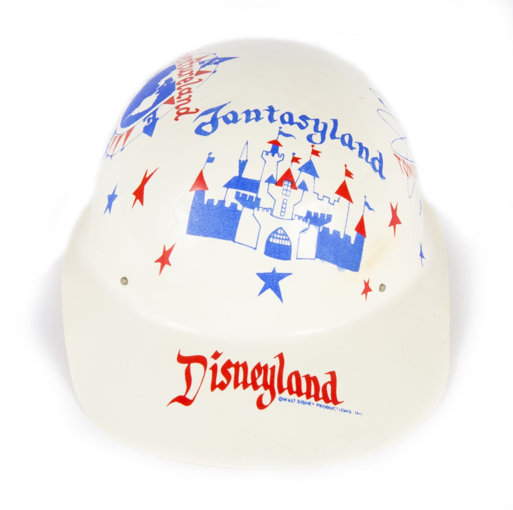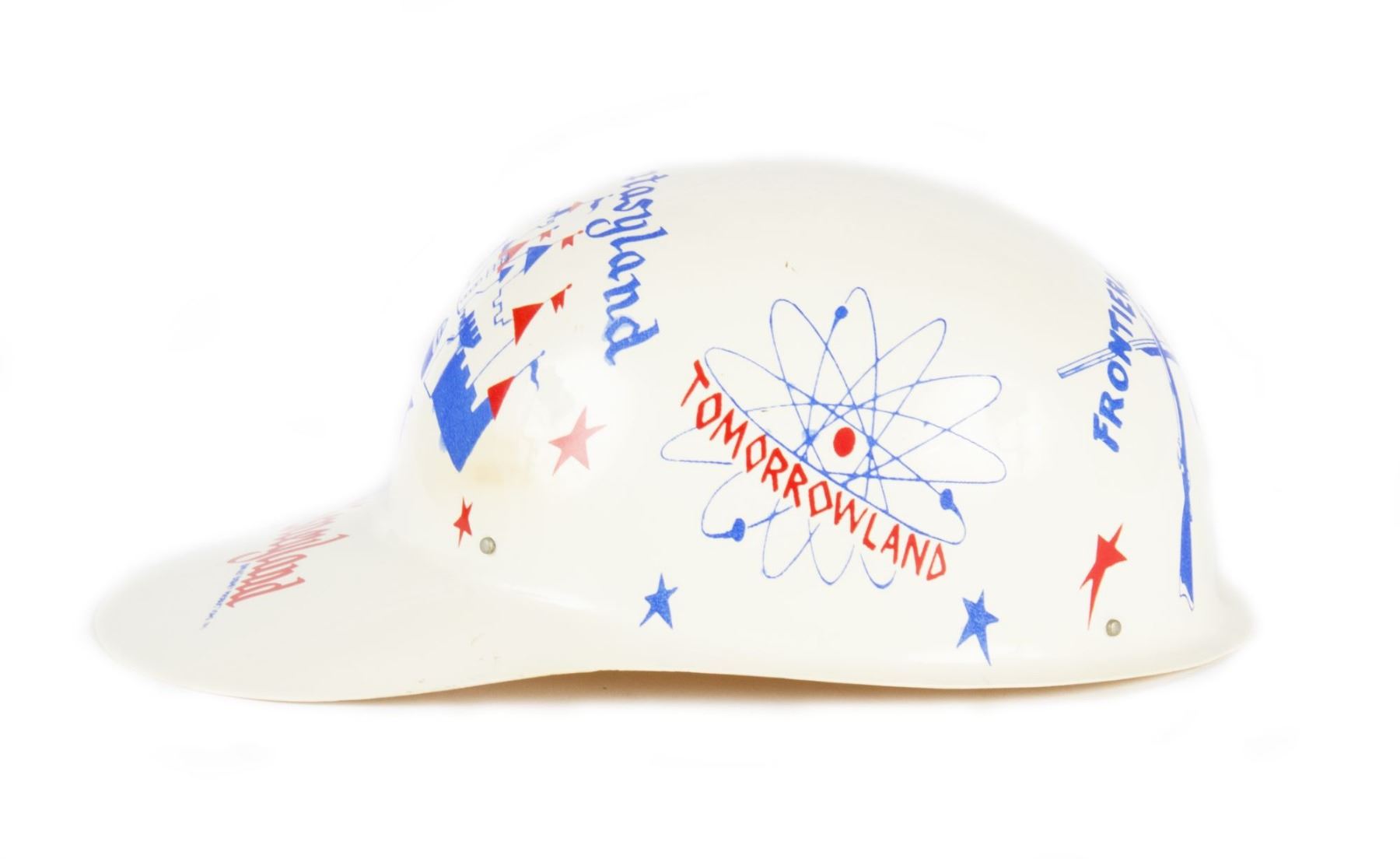 (Disneyland, c.1956) A souvenir white "keppy cap" featuring artwork of the different lands of the park. The child's cap measures 11"x7.5" and 4.5" tall and is in good condition with minor wear from use.