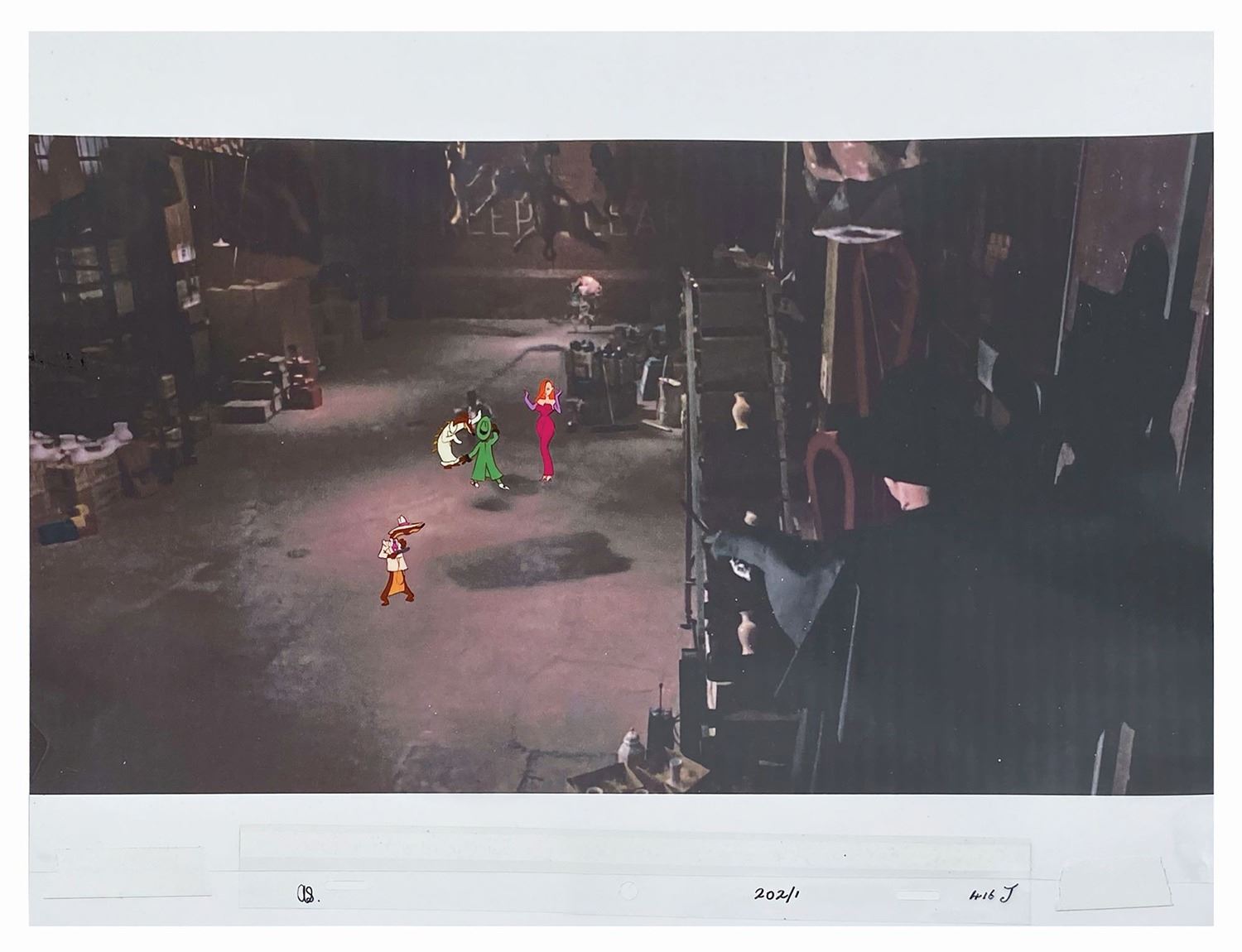 (Disney, 1988) An original production cel of Jessica Rabbit and the Toon Patrol weasels from the 1988 ground-breaking film, Who Framed Roger Rabbit. The cel measures 12.5"x16.5" and has been placed over a scene-matching printed background for a beautiful display. The total image size of the characters is 3"x2.5". The cel is in very good condition with minor wear.