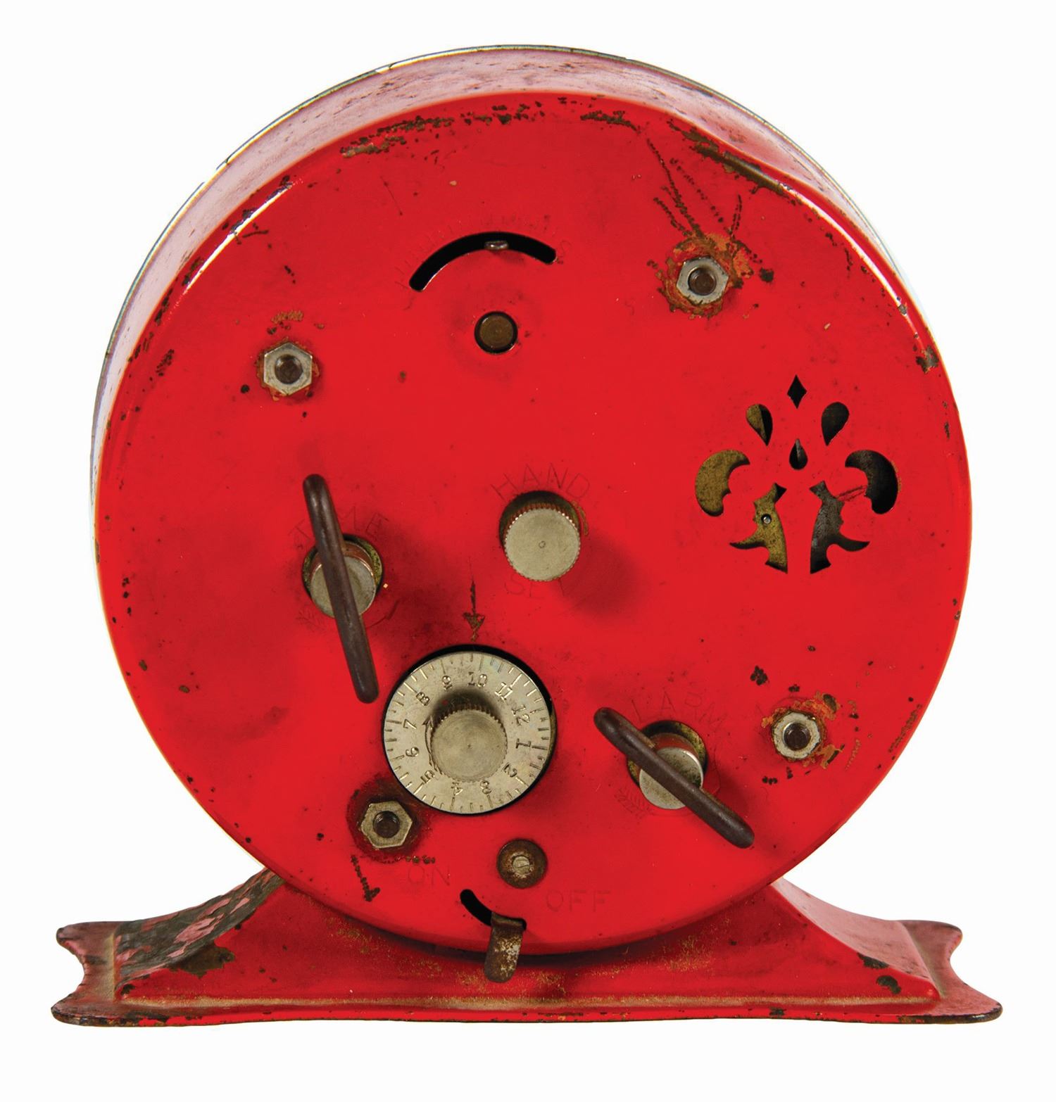 (Ingersoll, 1934) A charming alarm clock by Ingersoll featuring imagery of the Three Little Pigs and the Big Bad Wolf. The wolf's arms provide the hour and minute hands, while his head moves to "bite" as the seconds pass. The clock face measures 4" in diameter, and overall measures 4.25"x4.5". The condition is fair, with chipping and scratching throughout, and a dent on the top of the casing. The clock face has significant color loss. The time can still be manually adjusted, however the clock will likely require servicing to be fully functional.