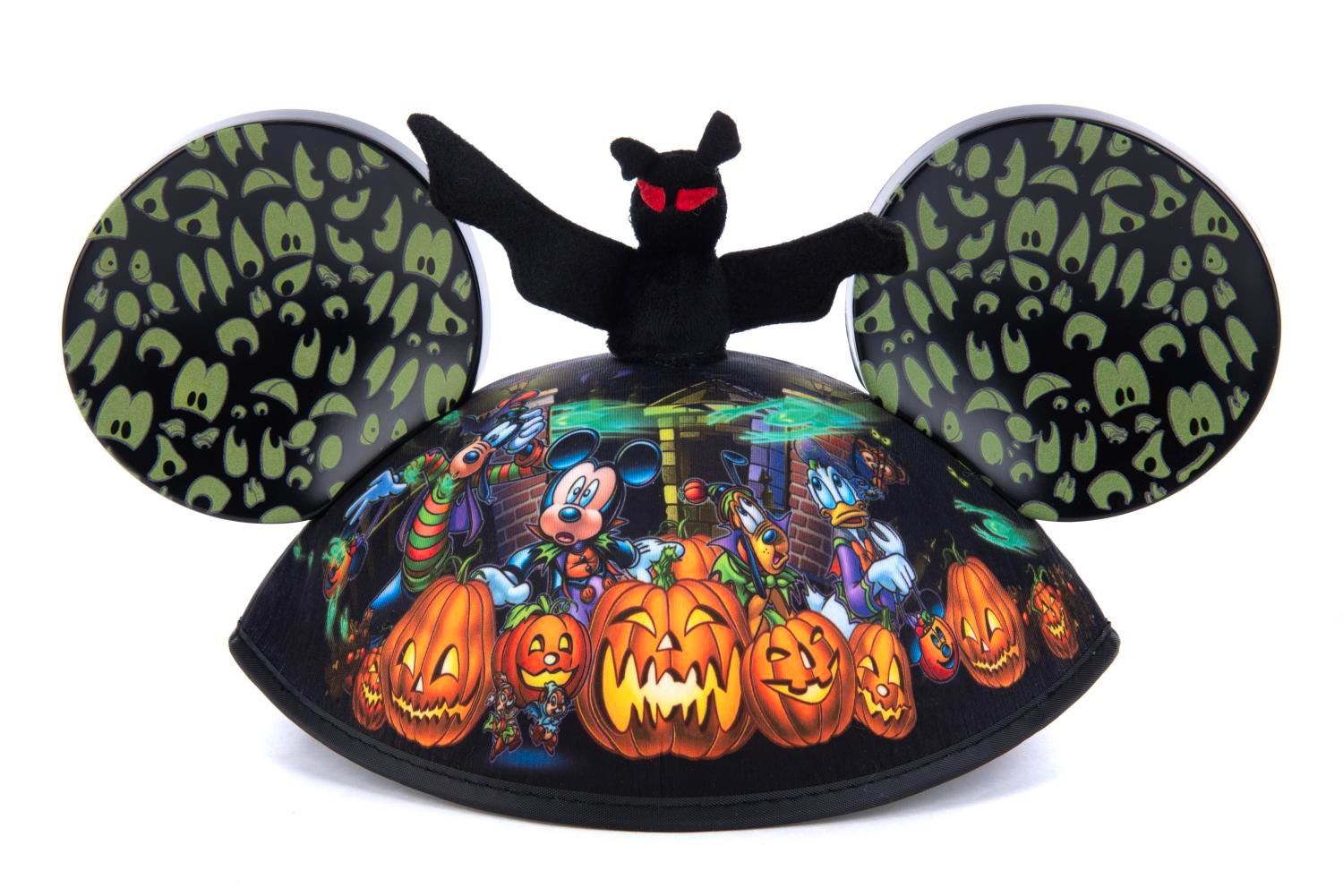 (Disneyland Resort) A Disney Parks "Whose Eyes Are Those?" Halloween Mickey Ear Hat. The hat features screen printed imagery of the Standard Characters trick-or-treating, while the ears contain character eyes and an "answer key" on the reverse. The one-size polyester hat is in very good unused condition with minor creases on reverse.