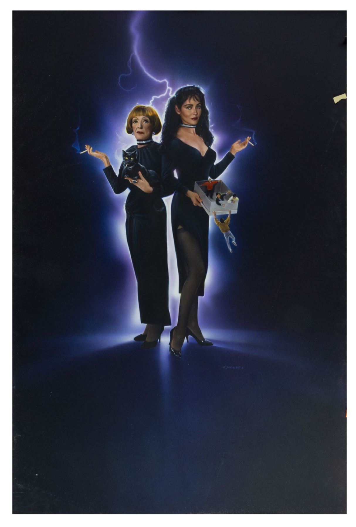 (MGM, 1989) An original painting created for Wicked Stepmother, starring Bette Davis and Barbara Carrera. Featuring the incredible artwork of Stan Watts, this painting is accomplished in primarily airbrush and acrylic on art board, and was used in the creation of the film's theatrical release poster. The artwork has a clear protective layer hinged over the top with hand-written development notes. Measuring 40"x27.5", the artwork is in fair to good condition. There is tape around edges that is starting to come loose in areas, some folds and creases to the clear protective cover, and some minor wear throughout the artwork including some light scuffing. The dry original tape around the edges has caused a slight "dusting effect" around the border from age.