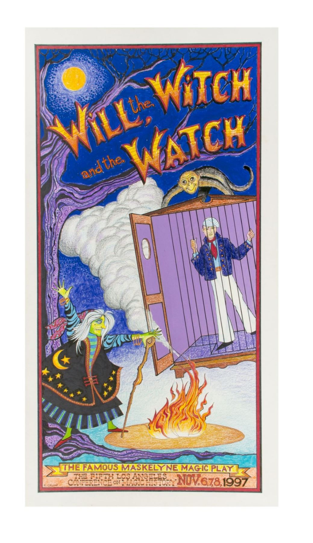 (1997) An original mixed media poster design by Rolly Crump. This poster artwork was created for the Fifth Los Angeles Conference on Magic History, and was designed by Crump in the style of vintage magic posters. Accomplished in acrylic, ink, pencil, and colored pencil on artist's board, this poster design measures 26"x14" and is signed by Crump in the lower-left corner. The condition is very good with minor edge-wear.