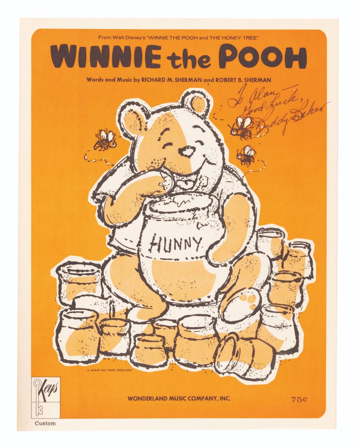 (Disney, 1963) Signed sheet music for “Winnie the Pooh” composed by the Sherman Brothers. The cover is signed with a dedication by Buddy Baker, the prolific Disney composer who provided the score for “Winnie the Pooh and the Honey Tree,” which marked the first time the “Winnie the Pooh” song was used in a film. Measuring 8.5” x 11”, the sheet music displays in very good condition with light edge wear and discoloration from age.
