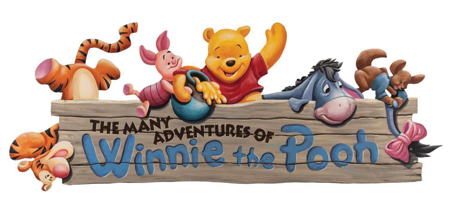 (Disneyland, 2000s) A very large hand-painted wooden sign used within The Many Adventures of Winnie the Pooh at Disneyland. During the opening years of the attraction, this large sign could be seen installed on the exterior of the barn just before guests would exit their beehive-shaped vehicles. Likely used beginning in 2003 for the opening year of the Disneyland attraction, this prominently-used attraction signage survives as an incredible testament to this Park classic. The reverse maintains the sign's hanging brackets, and there are three unobtrusive screw holes in the sign. Measuring an impressive 29.5"x76.5", the attraction sign is in very fine Park-used condition. Special shipping arrangements may apply, please inquire for details and estimates.