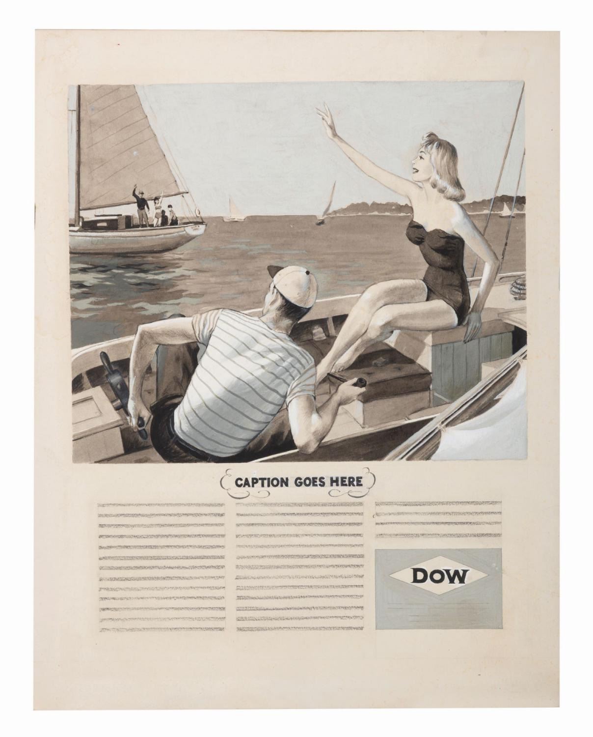 (Dow, 1940s-1950s) An original painting for a Dow Chemicals magazine ad, accomplished in graphite, ink, and gouache. Dow grew greatly during World War II, and in the post-war advertised heavily to promote their products' value in everyday life. This is the concept painting for an ad in their standard magazine format of a painted image of American life (made better through chemistry), with caption and text beneath, and logo in the lower right corner. Measuring 12.5"x16.5", the piece is in very good condition with slight wear from handling.